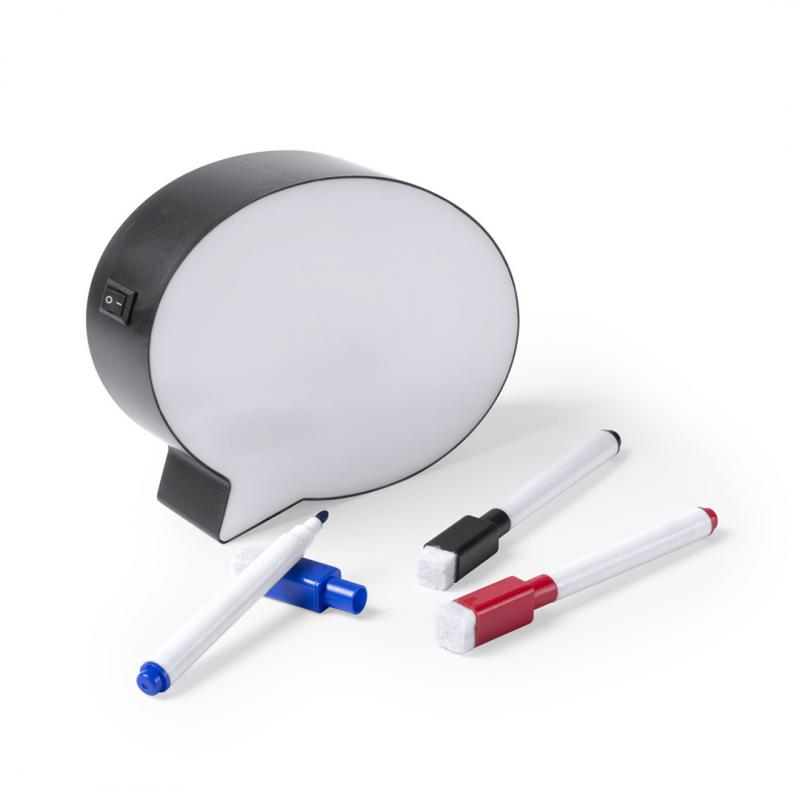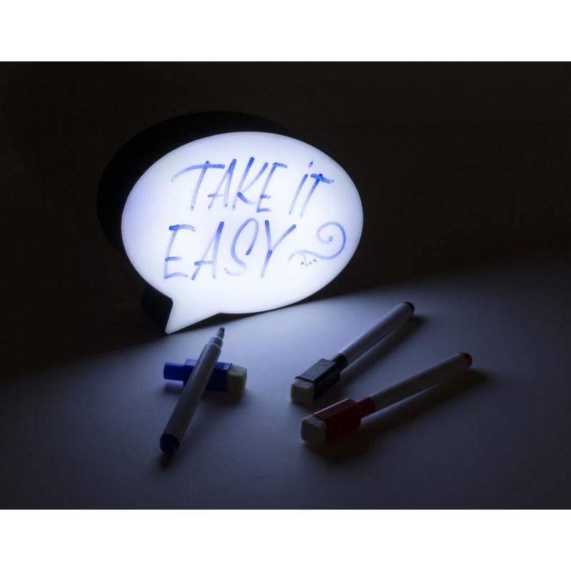 Divertida pizarra bocadillo con interior iluminado por 8 ledes. Con botón ON/OFF y tres rotuladores con borrador en colores azul, negro y rojo incluidos. Alimentación a pilas: 3xAAA no incluidas y presentada en atractiva caja de diseño.