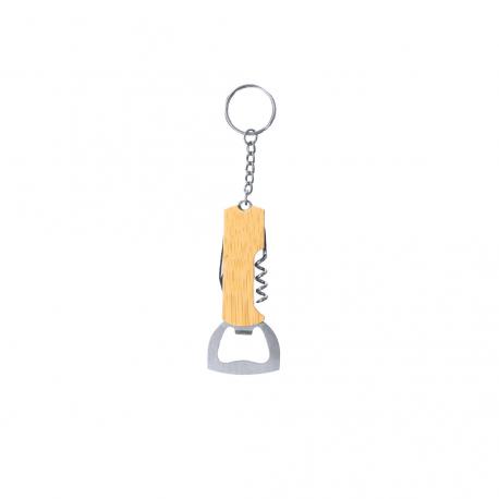 Llavero abridor fabricado en bambú y acero inox, con abridor de botellas y sacacorchos, incluye cuchilla y argolla de metal para llaves.Materiales como el Bambú fomentan la utilización de materias primas naturales reduciendo las emisiones contaminantes. Además, el bambú proviene de una planta de gran resistencia y versatilidad, con crecimiento y regeneración rápida, siendo una excelente alternativa al uso de madera tradicional.