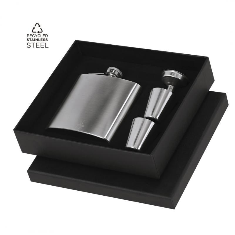 Set de Petaca con Accesorios en Acero Inoxidable Reciclado. Incluye:- Petaca de 175 ml con sistema antigoteo y cierre de rosca para un almacenamiento seguro y sin derrames.- Dos vasos medidores de 30 ml de capacidad.- Embudo de dosificación, que facilita el llenado.Incluye distintivo de Acero Inox Reciclado. Prresentado en caja negra.El acero es uno de los materiales más demandados y que puede encontrarse casi en todas partes, desde productos de uso diario a grandes construcciones. Con innumerables propiedades, entre las que cabe destacar la durabilidad y su alto grado de reutilización, convirtiéndolo en una alternativa muy valorada en soluciones de sostenibilidad. Debidamente tratado, permite obtener nuevos recursos de infinita utilización.