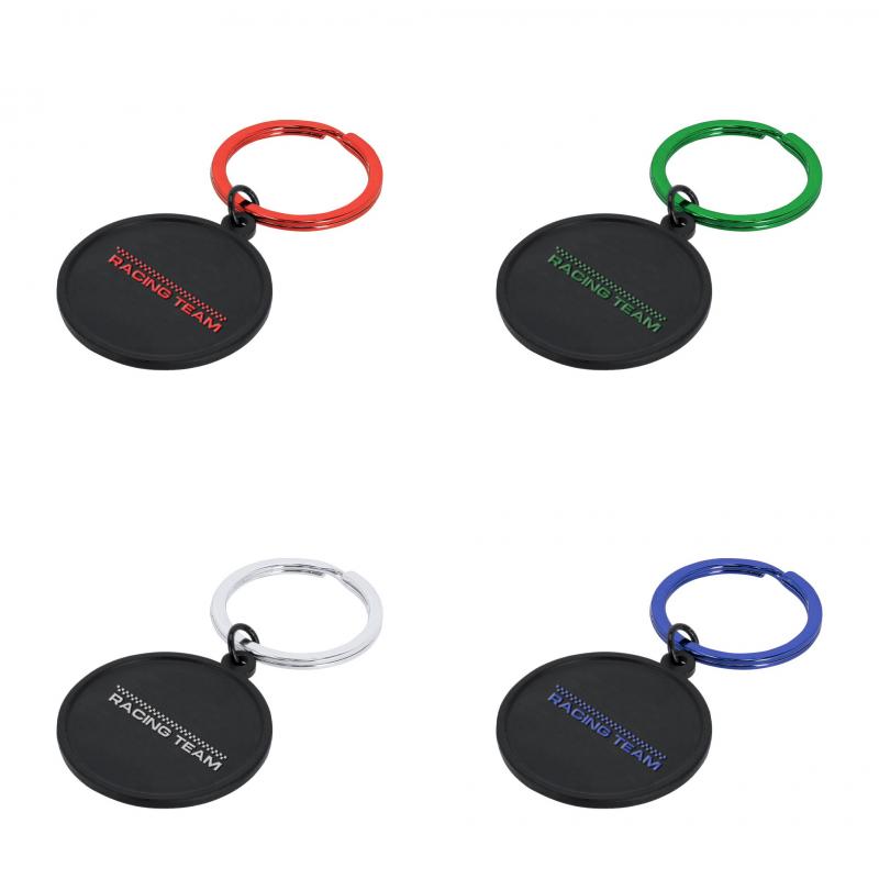 Llavero elaborado en aluminio con diseño redondo en color negro. Ideal para grabado láser con acabado a color por ambos lados del llavero con efecto espejo. Incluye una anilla metálica a juego para resultado elegante.