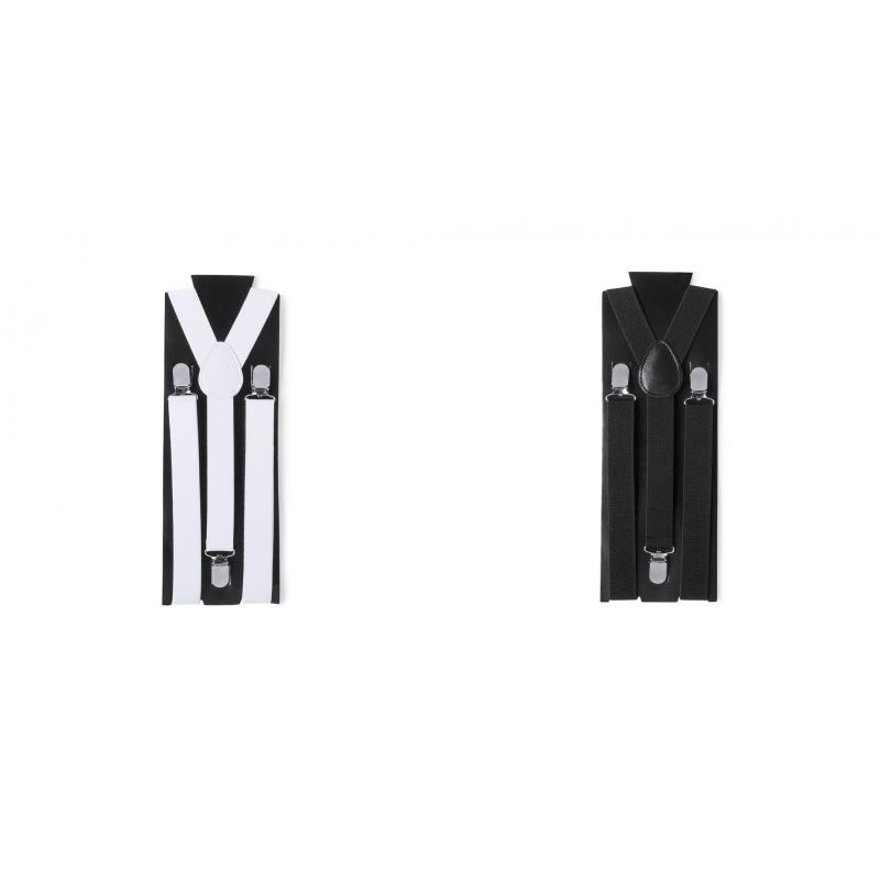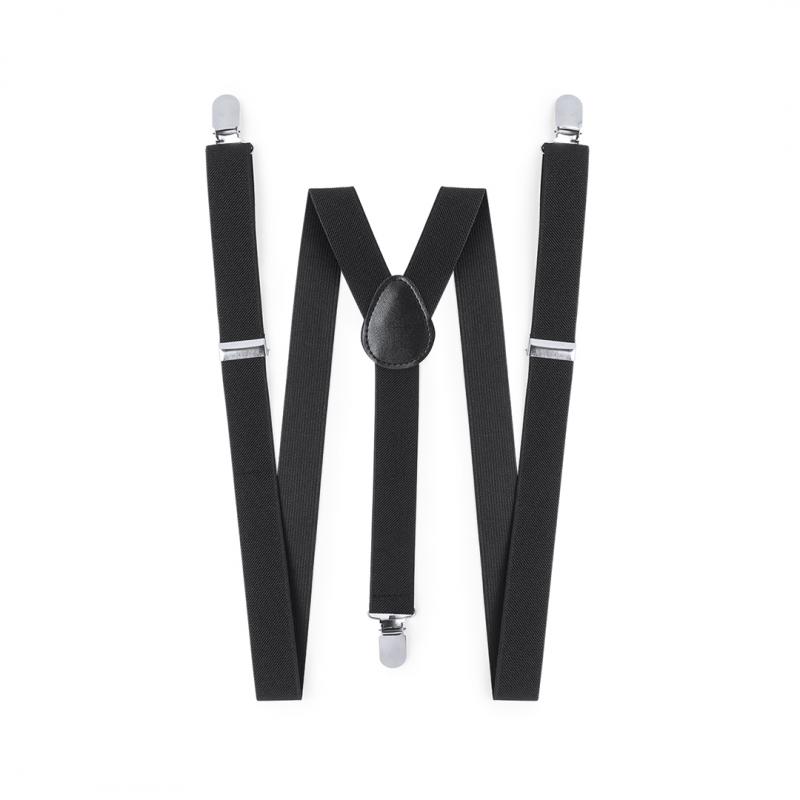 Tirántes elásticos de poliéster en sobrios colores con accesorios metálicos. Con refuerzo de polipiel en espalda a juego y presentados en original cartulina individual de color negro.