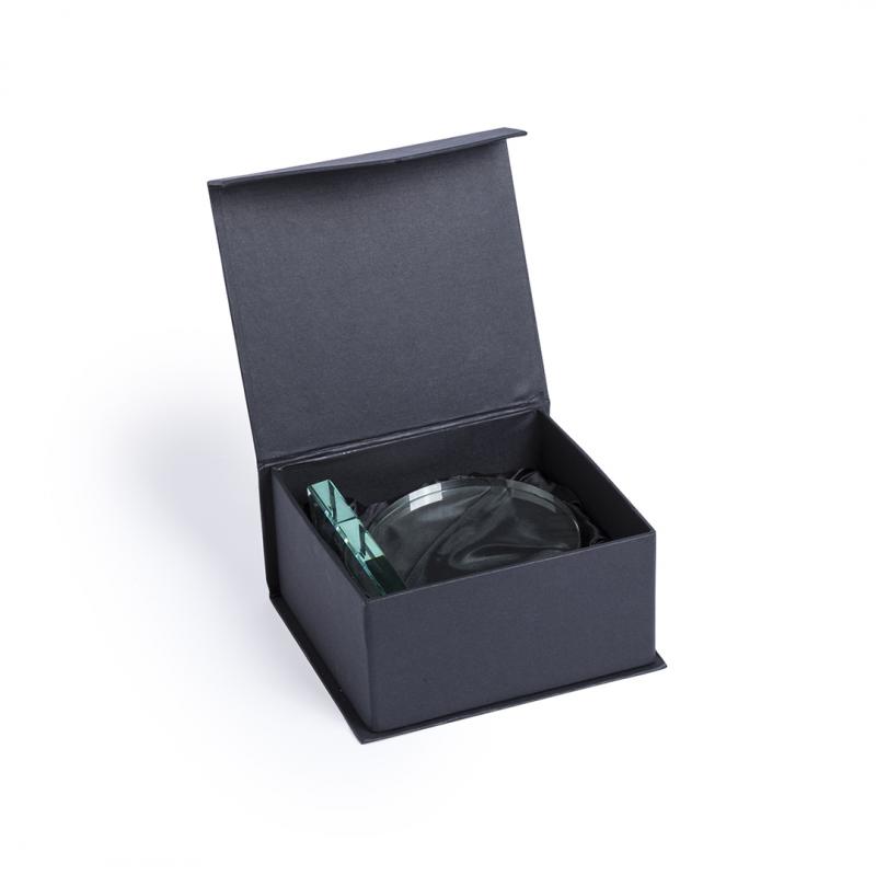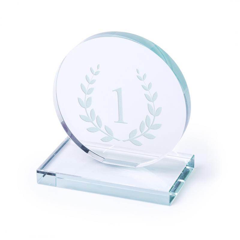 Placa trofeo de grueso cristal con elegante diseño circular y base cuadrada. Especialmente diseñada para marcaje a láser y presentada en estuche de protección individual.