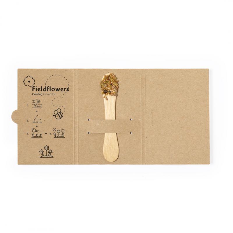 Stick con semillas. En uno de los extremos tiene una zona amplia para marcaje y en el otro extremo incluye semillas de flores silvestres listas para plantar. Presentado en una tarjeta de cartón reciclado con instrucciones de plantado.