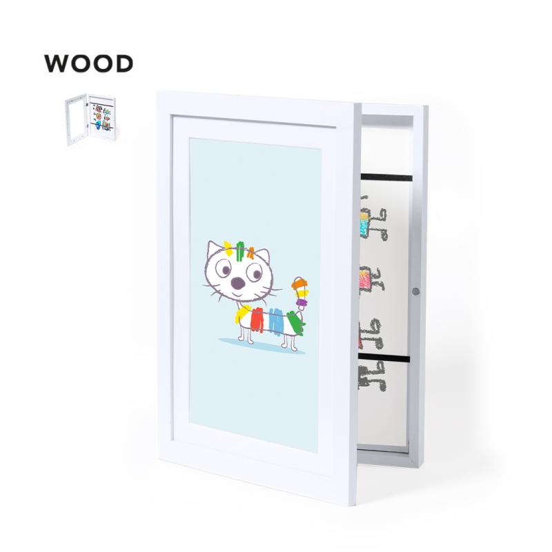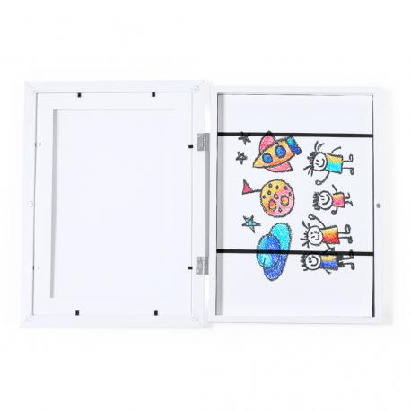 Elegante marco de arte que combina funcionalidad y estilo. Ofrece un compartimento para almacenar diseños de tamaño A4 sujetos por bandas elásticas, mientras que en su portada incorpora un marco para resaltar el diseño elegido. Se destaca por su apertura de bisagras y cierre magnético, garantizando un manejo práctico y seguro. Presentado de forma individual en caja de diseño kraft.