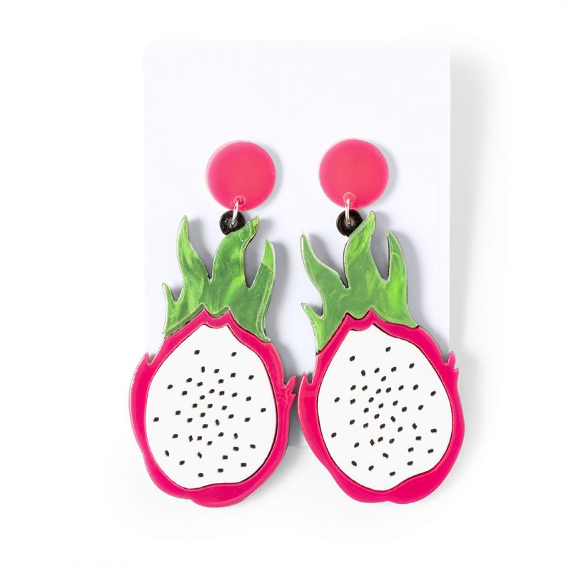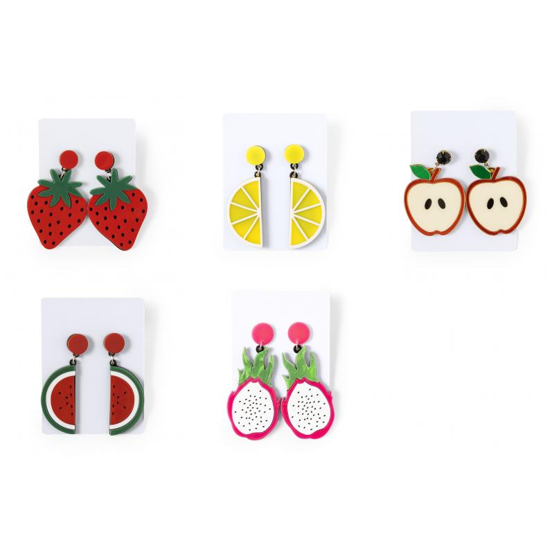 Fresca y original colección de pendientes frutales. Cautivadores y llenos de color, tienen forma de fresa, pitaya, manzana, sandía o limón, siendo una declaración de estilo. Fabricados con atención a los detalles y con cierre de clip. Presentados individualmente en cartón blanco y embolsados.