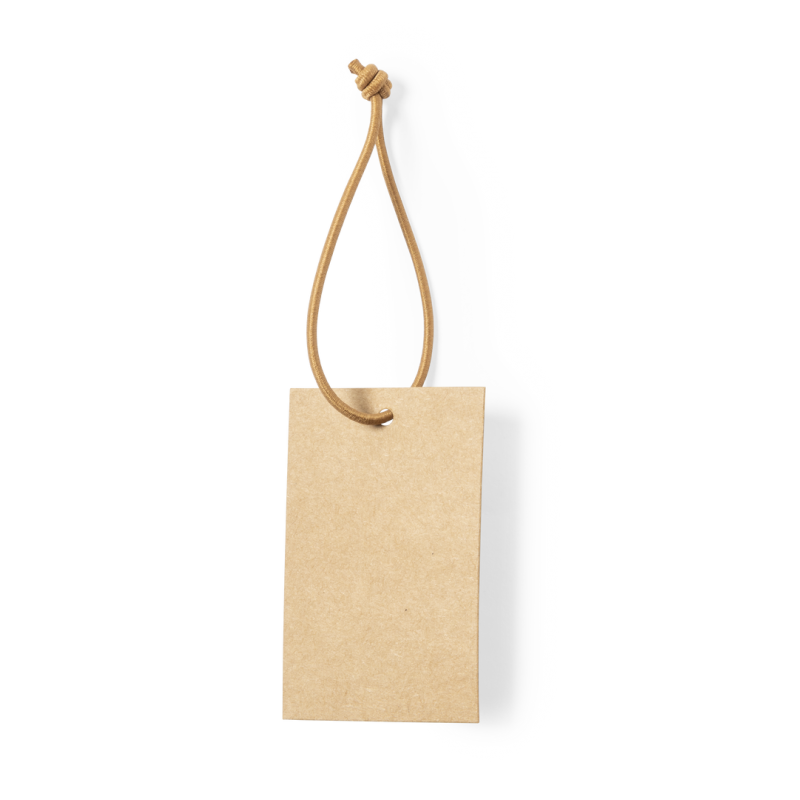 Etiqueta tipo hangtag de presentación, fabricada en cartón reciclado. De acabado kraft, con cuerda elástica para colgar en color marrón a juego. En línea con la tendencia del mercado hacia la sostenibilidad integral del regalo, ofreciendo soluciones de origen reciclado con el fin de ayudar a la mejora y conservación de nuestro planeta.