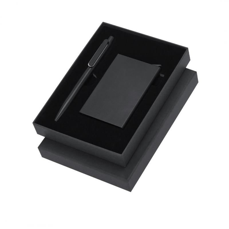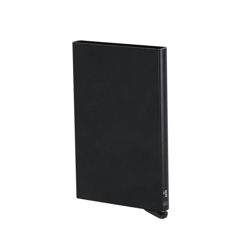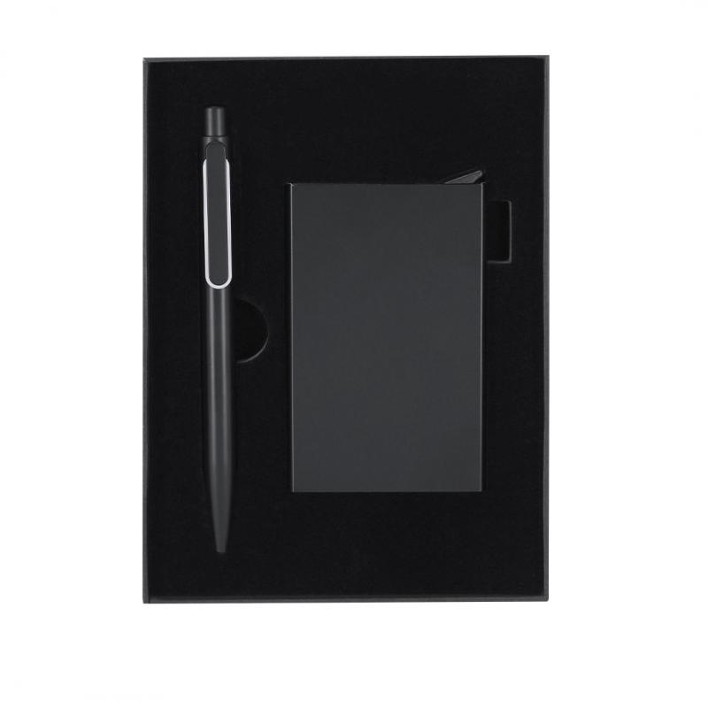Set de bolígrafo y tarjetero fabricados en Aluminio Reciclado.El set incluye:- Bolígrafo en negro mate fabricado en Aluminio Reciclado de mecanismo pulsador con clip y elemento decorativo en metal pulido. - Tarjetero en negro fabricado en Aluminio Reciclado apto para 6 tarjetas con RFID y mecanismo pulsador para extrar las tarjetas.Ambos con logo de Aluminio Reciclado grabado y presentado en una elegante caja negra con interior troquelado. El Aluminio Reciclado es un material con posibilidades de reciclaje casi infinitas, sin perder sus propiedades originales y consumiendo menos energía en este proceso.Certificación GRS (Global Recycled Standard / Estándar de Reciclaje Global), que garantiza el origen reciclado del material usado para fabricar el producto.