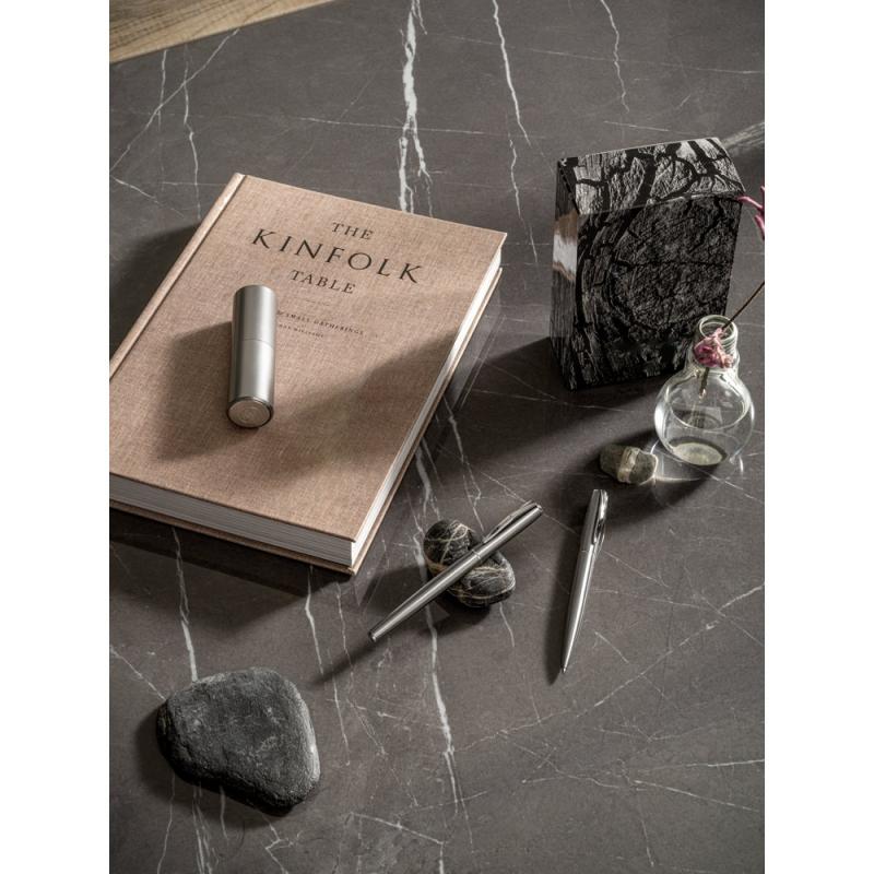 Set de bolígrafo y roller con cuerpo de acero inoxidable (53% rSS) con clip. Ambas piezas tienen escritura negra y el bolígrafo tiene un mecanismo giratorio. Se suministra en una caja de regalo de papel kraft fabricada con material certificado FSC™ y otros materiales controladosRecipiente :