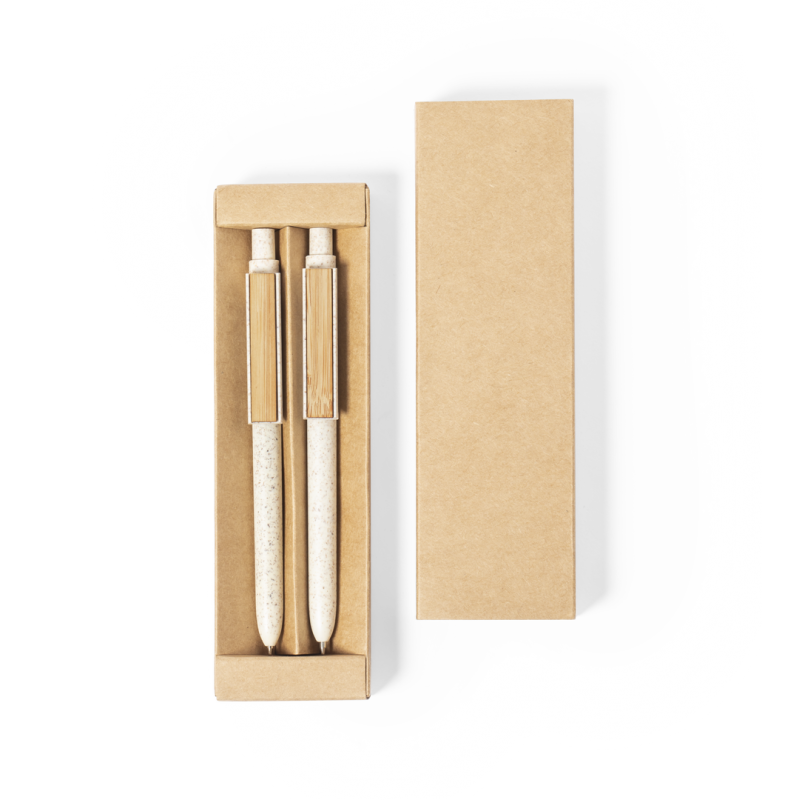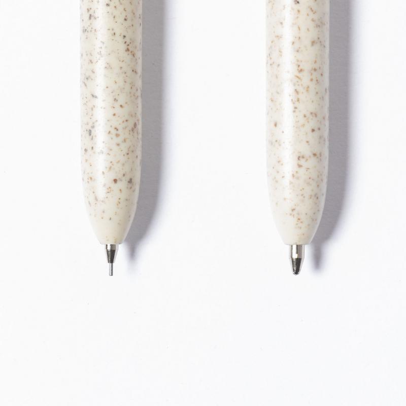 Set de bolígrafo y portaminas de línea nature. Fabricado en combinación de caña de trigo con clip en bambú, para así fomentar la utilización de materias primas naturales y reducir las emisiones contaminantes. Clip con amplia zona de marcaje. Bolígrafo en tinta azul y portaminas con 2 minas incluidas de 0,5mm. Presentado en estuche individual de cartón reciclado.Distintivo Wheat Straw en la parte superior del bolígrafo y portaminas.