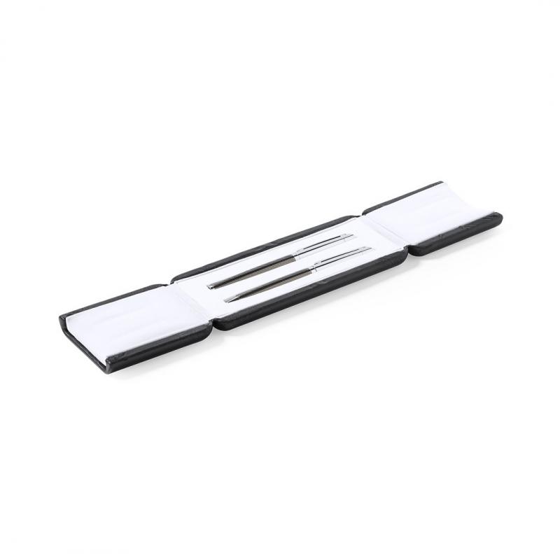 Set premium de bolígrafo y roller. Fabricado en elegante combinación de metal en tonos negros y cromados. Bolígrafo de mecanismo giratorio en tinta azul y con cartucho jumbo. Roller con capucha y tinta gel en azul, carga jumbo. Presentado en estuche individual de polipiel con interior en contraste de antelina en blanco.