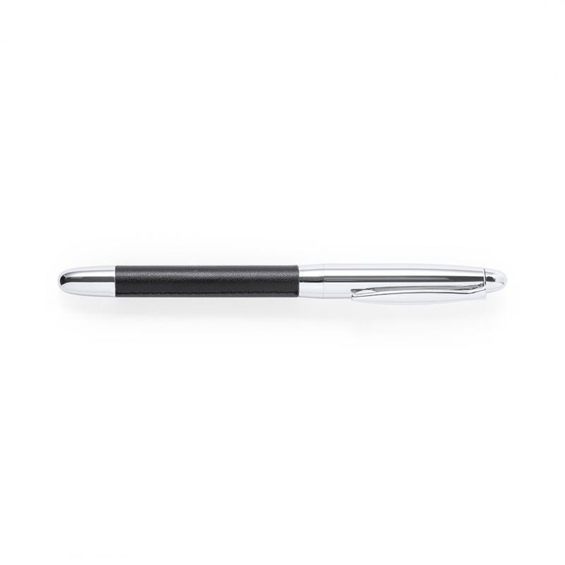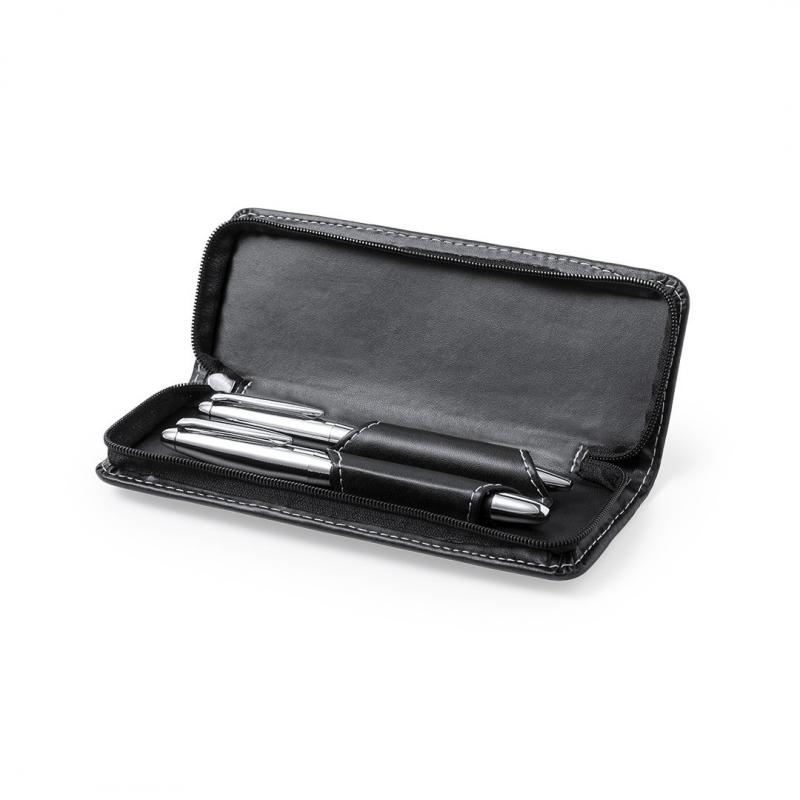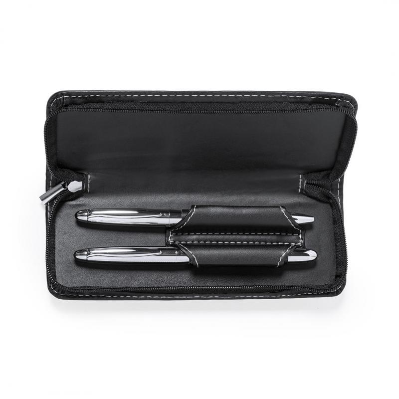 Set premium de bolígrafo y roller. Fabricado en elegante combinación de polipiel en tonos negros y metal cromado. Bolígrafo de mecanismo giratorio en tinta azul y con cartucho jumbo. Roller con capucha y tinta gel en azul, carga jumbo. Presentado en estuche individual de polipiel con cierre de cremallera e interior a juego con compartimentos individuales.