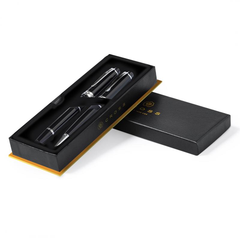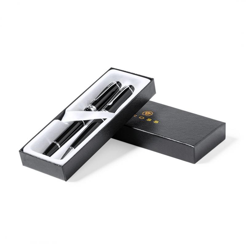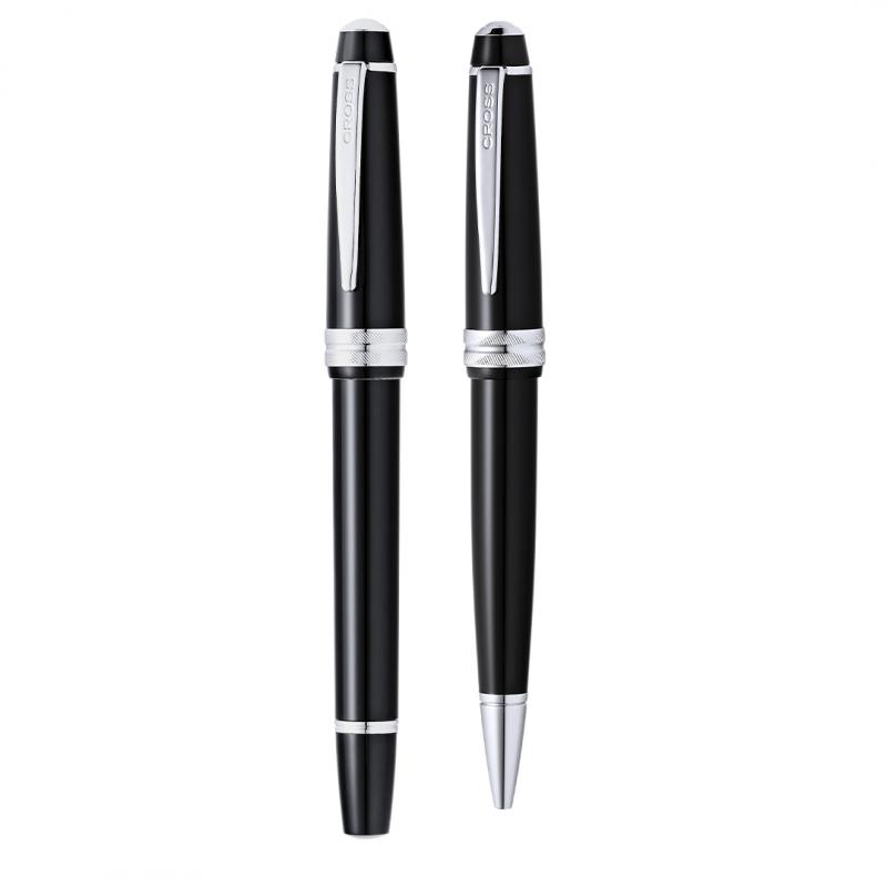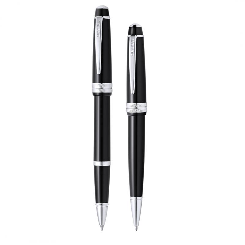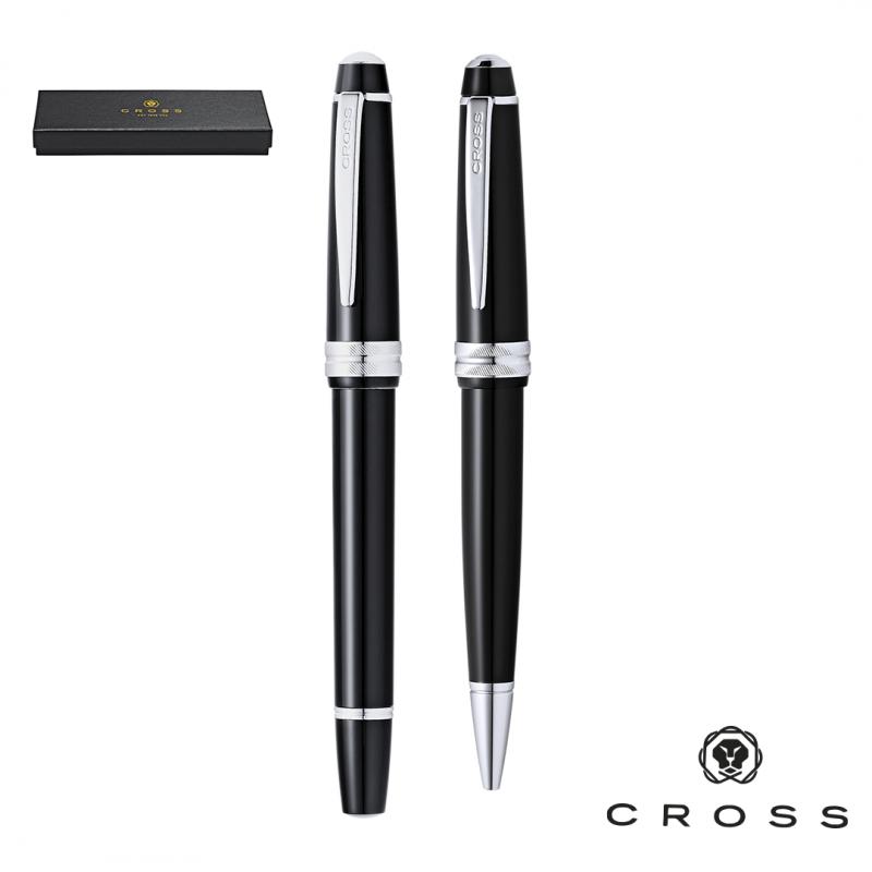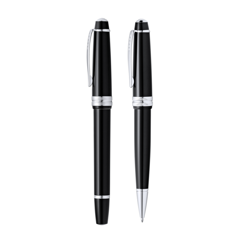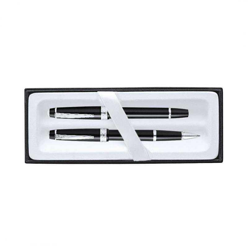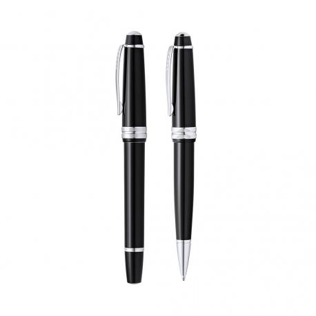 Set de bolígrafo y roller de Cross modelo Bailey Light, que combina una resina de alto brillo con acabados metálicos de cromo pulido. De cartucho jumbo y en tinta negra. Presentado en elegante estuche individual de color negro con logotipo de la marca, e interior en suave antelina.