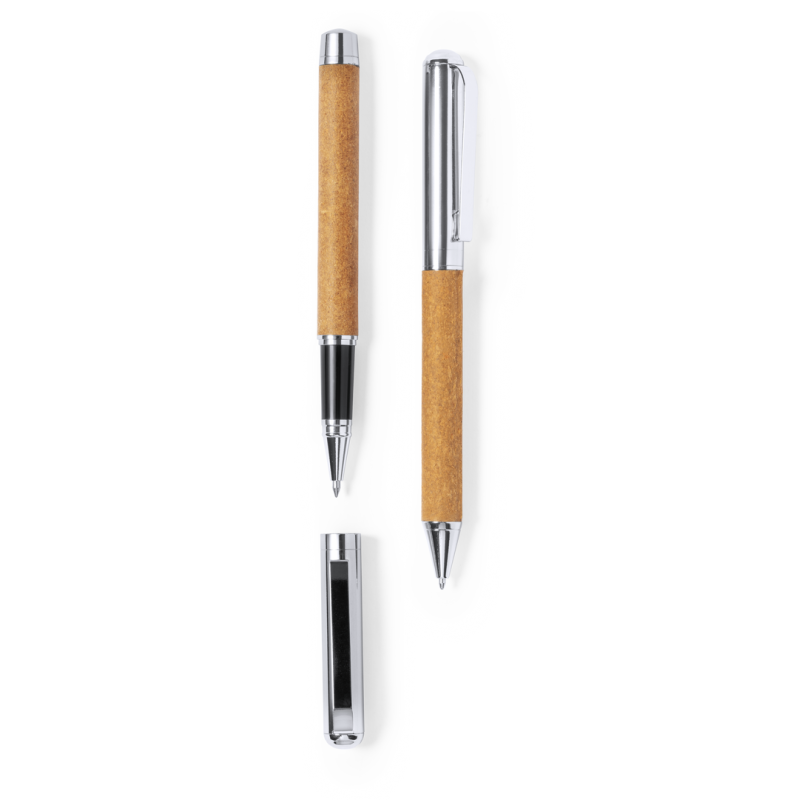 Set de bolígrafo y roller metálicos, con cuerpo recubierto en cuero reciclado. Incluye: Bolígrafo fabricado en metal cromado y con cuerpo recubierto en cuero reciclado. Elegante clip metálico y accesorios a juego. De mecanismo giratorio y en tinta azul, con distintivo cuero reciclado en cuerpo.Roller fabricado en metal cromado y con cuerpo recubierto en cuero reciclado. Elegante clip metálico y accesorios a juego. Con capucha y en tinta azul, con distintivo cuero reciclado en cuerpo.Set presentado en estuche individual de diseño kraft con funda a juego.El cuero reciclado rescata las fibras desechadas en los procesos de fabricación del cuero, minimizando el desperdicio de material, contribuyendo a reducir el impacto ambiental y manteniendo a la vez sus propiedades originales.