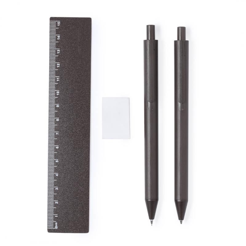 Set de bolígrafo, portaminas y regla, fabricados en fibra de café. Bolígrafo en tinta azul y portaminas con 2 minas incluidas de 0,7mm, ambos con clip. Incluye una práctica regla de 15 cm y útil goma. Presentado en estuche individual de fibra de café. Logotipo fibra de café en la parte superior del bolígrafo y portaminas.La fibra de café es una solución circular que se obtiene de la utilización de los residuos producidos en la obtención del café. Una alternativa sostenible que favorece la reducción del uso de plásticos, ahorrando energía en su proceso de fabricación y contribuyendo al cuidado del medio ambiente.