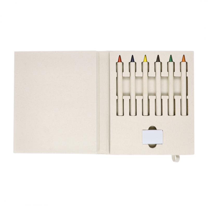 Set de lápices de colores eternos, fabricado con Cartones de Leche Reciclados. Incluye 6 diferentes colores, goma de borrar y bloc de notas con 50 hojas lisas. Con práctico elástico de cierre y distintivo de Cartones de Leche Reciclados.Los Cartones de Leche se componen en su mayor parte de cartón y aluminio. Durante su proceso de reciclado, se separan los distintos materiales del envase para su reutilización y nuevo uso, contribuyendo así a recorrer el camino infinito de la economía circular. Este material se caracteriza por su alto grado de reciclabilidad, así como por su ligereza y resistencia.