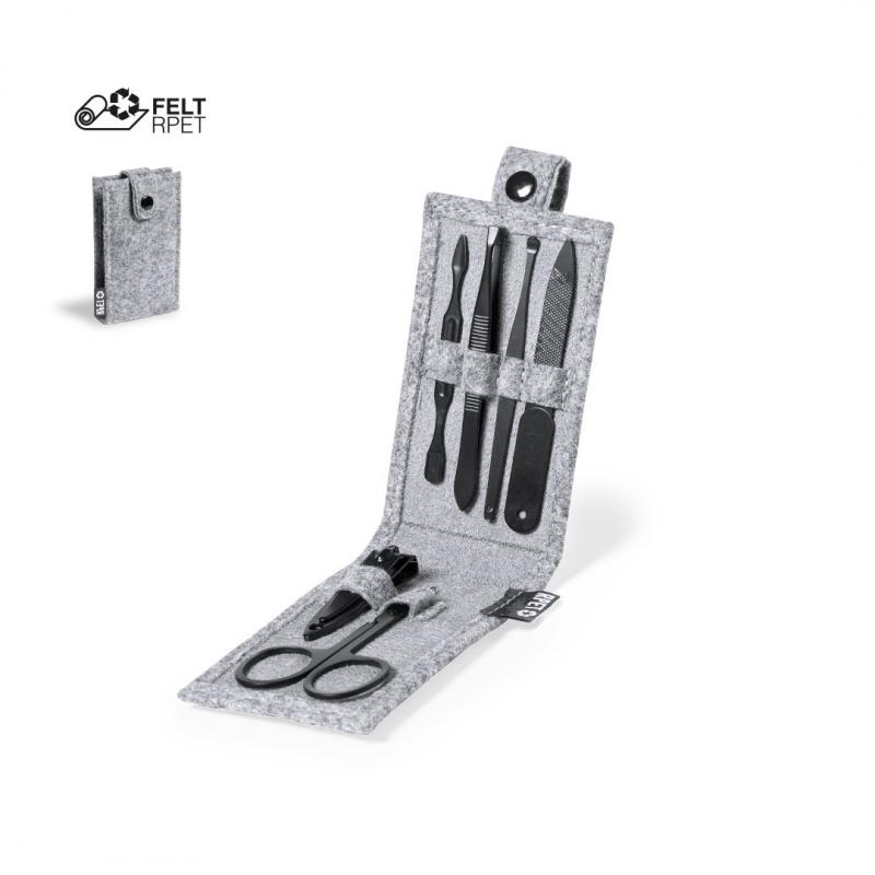 Set de manicura de 6 accesorios, con funda fabricada en resistente fieltro RPET, fruto de la combinación del proceso de reciclaje de materiales plásticos junto con la técnica milenaria de fabricación del fieltro, dando como resultado un material de eco-tendencia que, además de ser de origen reciclado, también se convierte en reciclable. Accesorios metálicos en acero inox de acabado negro: tijeras, pinzas, cortaúñas, lima y 2 quitacutículas. Con cierre de botón y etiqueta distintiva RPET en exterior.