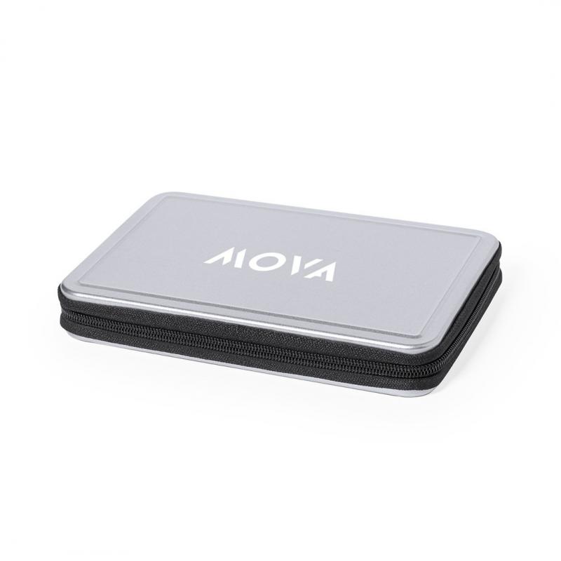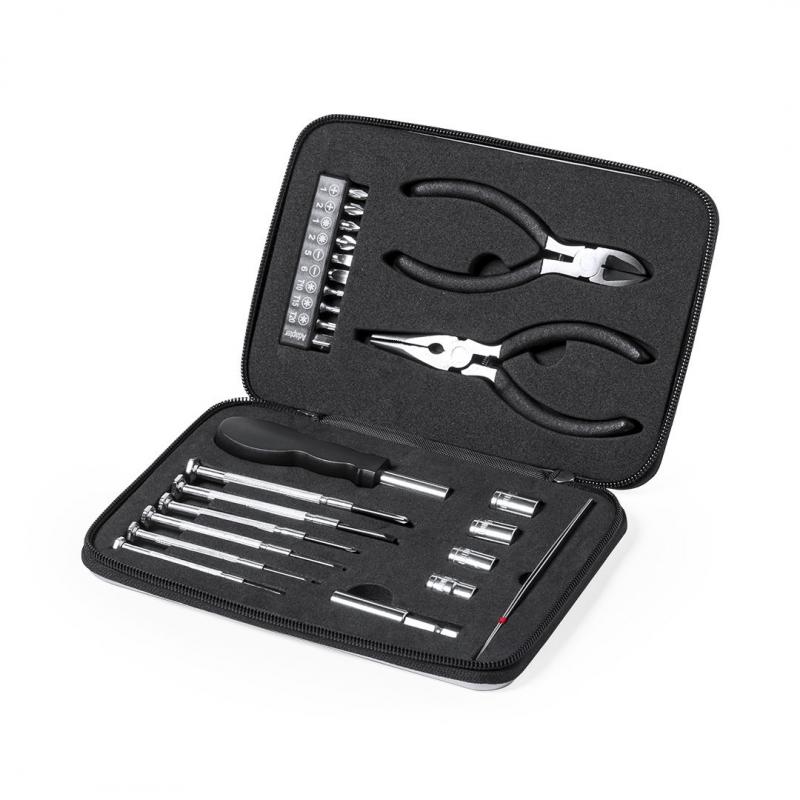 Set de herramientas de 25 accesorios en resistente estuche de aluminio con interior troquelado en EVA. Incluye set de destornilladores de precisión, mango multifunción, puntas intercambiables, destornilladores planos y de estrella. cabezales de tubo. pinzas y alicates. Presentado en caja individual.