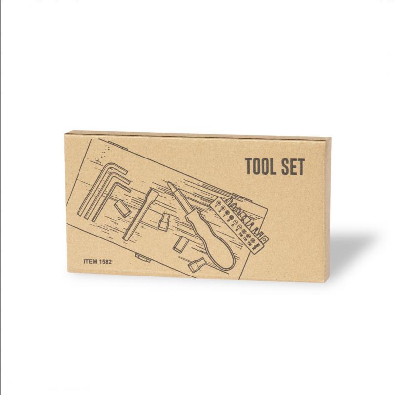 Set de herramientas de línea nature, presentado en resistente caja de bambú con cierre metálico. Con interior troquelado en bambú para un perfecto ajuste de las herramientas. Incluye destornillador con multitud de puntas planas, philips, hexagonales y torx; juego de llaves allen en distintas medidas y llaves de tubo con accesorio alargador. Presentado en caja individual de diseño kraft.