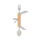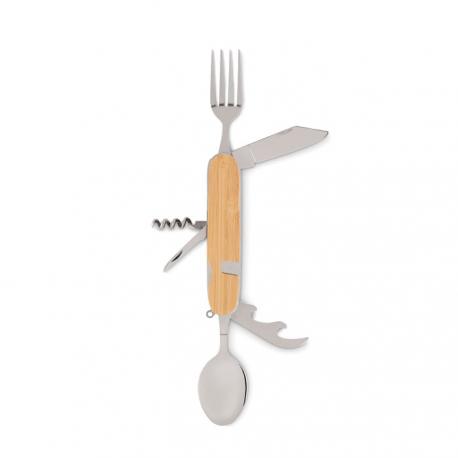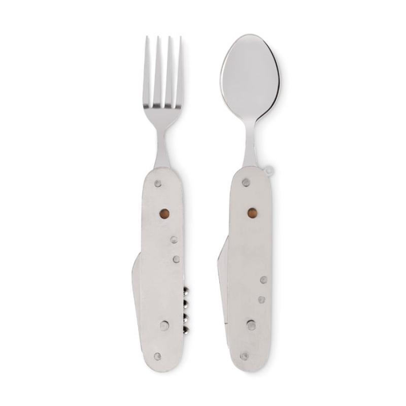 Set de cubiertos metálicos plegables multifunción para camping y mango de madera. 5 funciones. Incluye tenedor, cuchara, abrelatas, abridor de vino y cuchillo. Se pueden separar las piezas en 2.