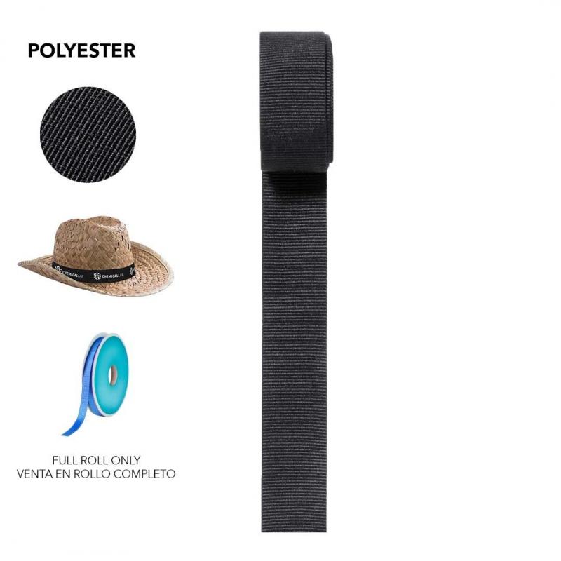 Cinta de poliéster extra ancha para sombrero. Servida en rollos completos de 100 metros de largo, con aproximadamente 150 cintas de 67 x 3,7cm. Disponible en variada gama de colores.