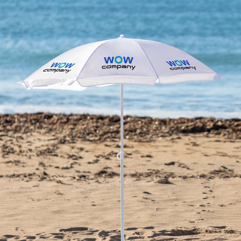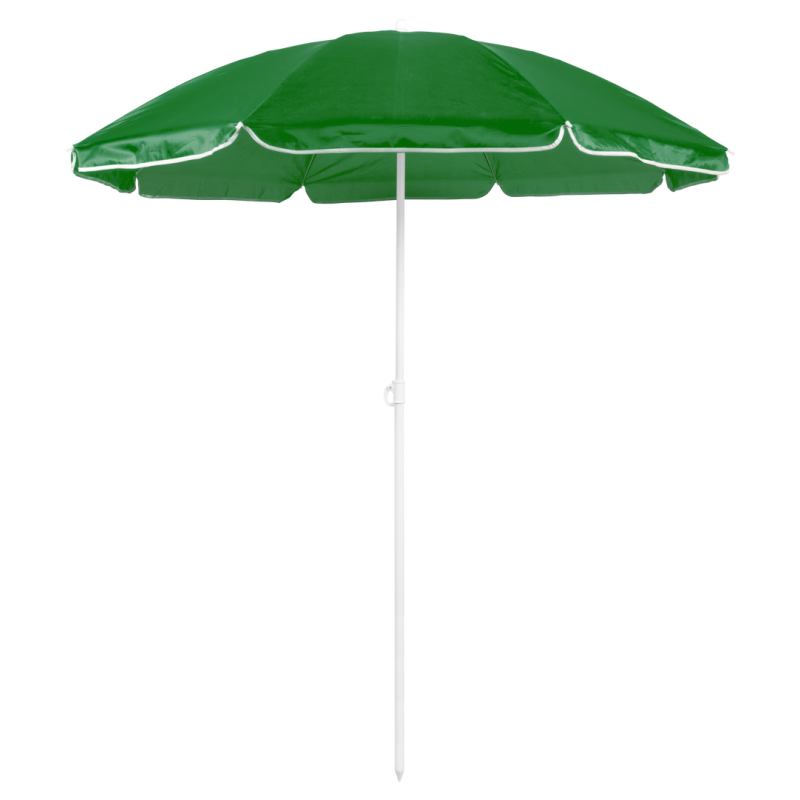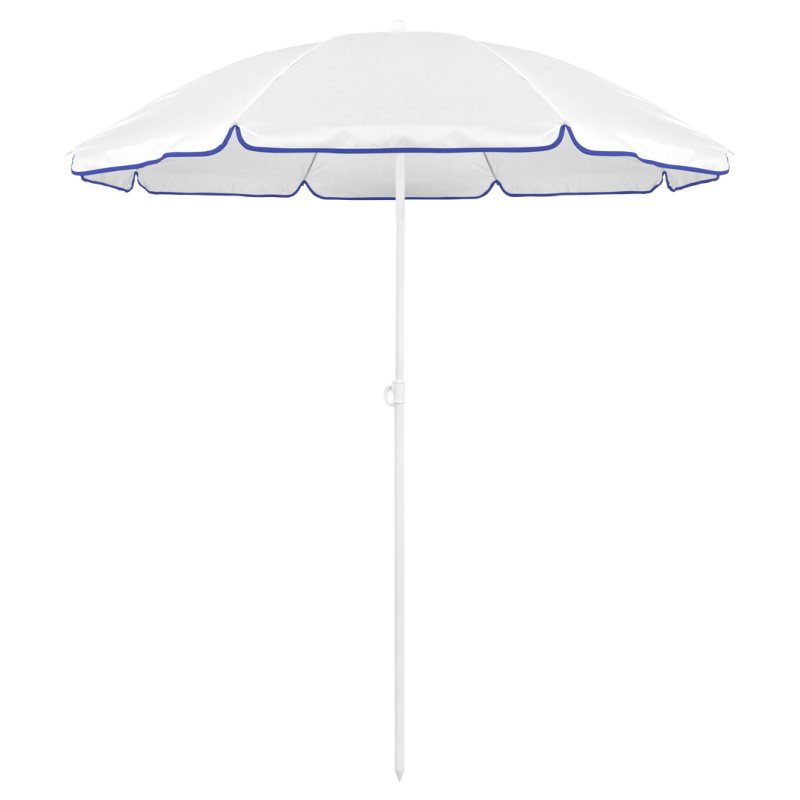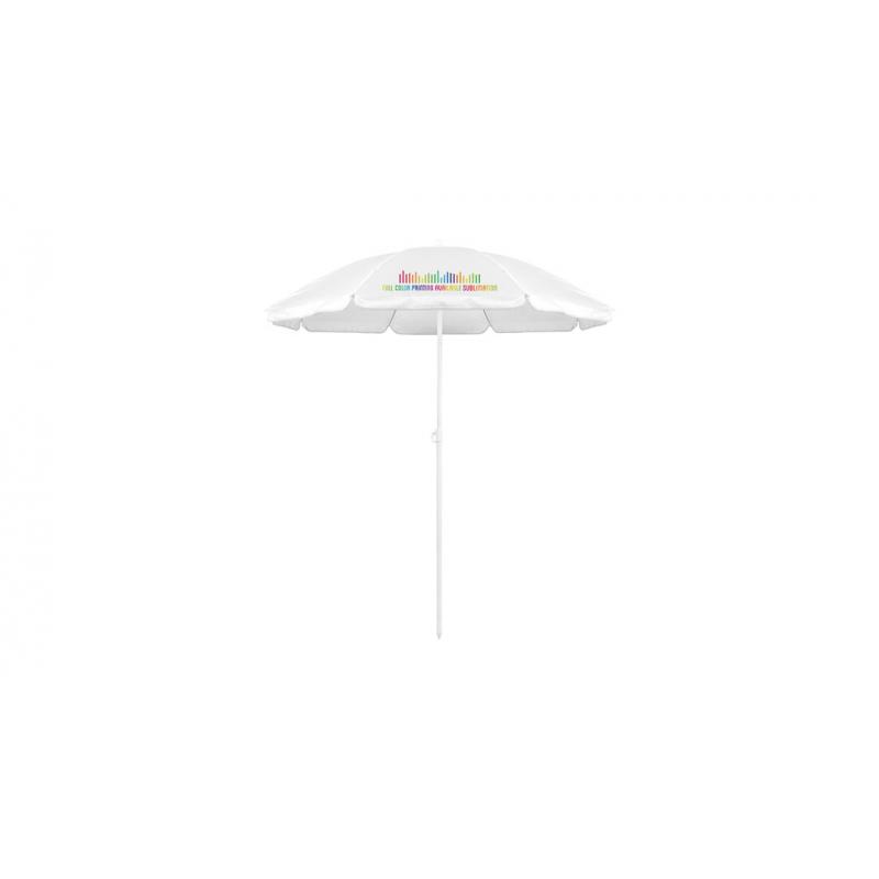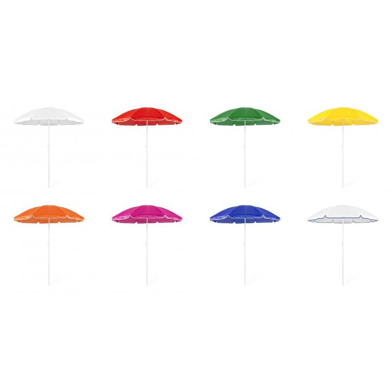 Sombrilla de playa de 8 paneles de resistente nylon en variada gama de vivos colores. De 150cm de diámetro, con faldones laterales ribeteados, tubos metalizados en color blanco y ajustable en altura. Presentada en funda de PVC con cinta de transporte para hombro.