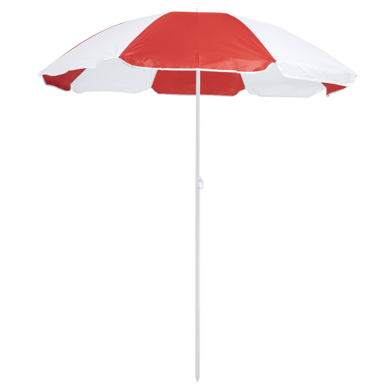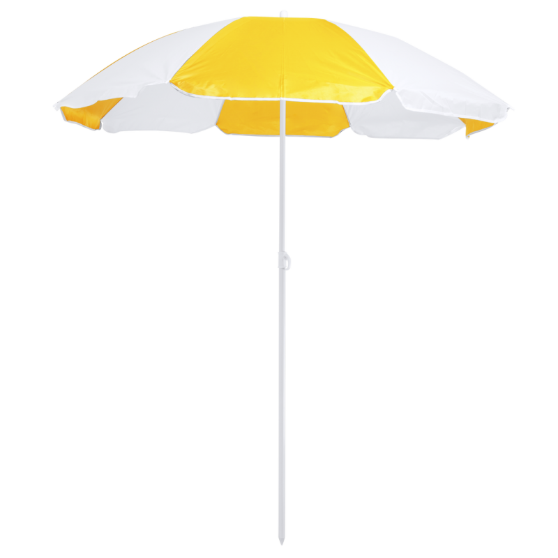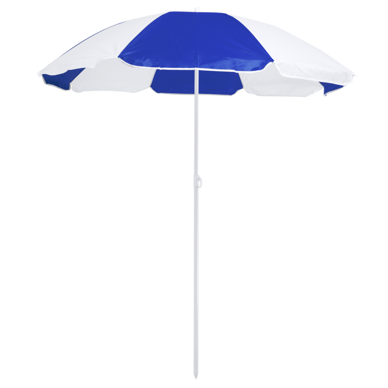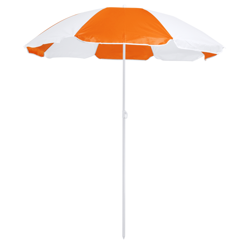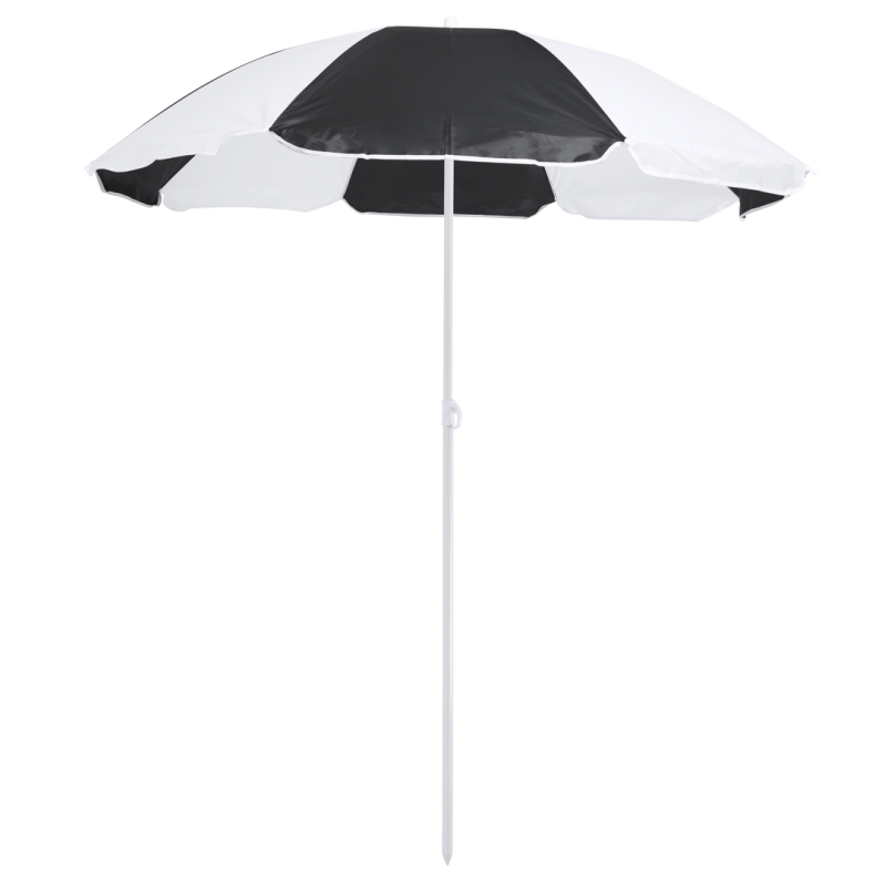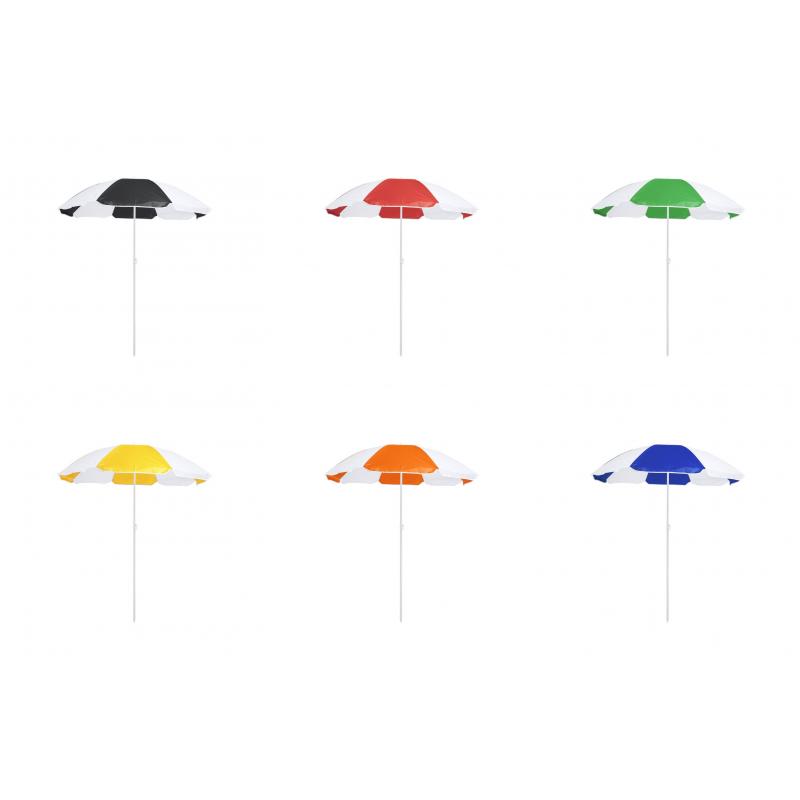 Sombrilla de playa de 8 paneles en resistente nylon de combinación bicolor. De 150cm de diámetro, con faldones laterales ribeteados, tubos metalizados en color blanco y ajustable en altura. Presentada en funda de PVC con cinta de transporte para hombro. Disponible en variada gama de colores combinados.