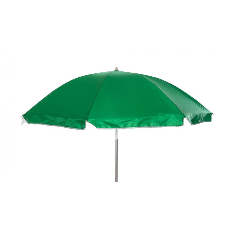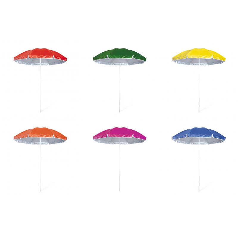 Sombrilla de playa de 8 paneles de resistente nylon e interior en color gris plateado con protección UV. En variada gama de vivos colores, de 150cm de diámetro, con faldones laterales ribeteados, tubos metalizados en color blanco y ajustable en altura. Presentada en funda de nylon con cinta de transporte para hombro.