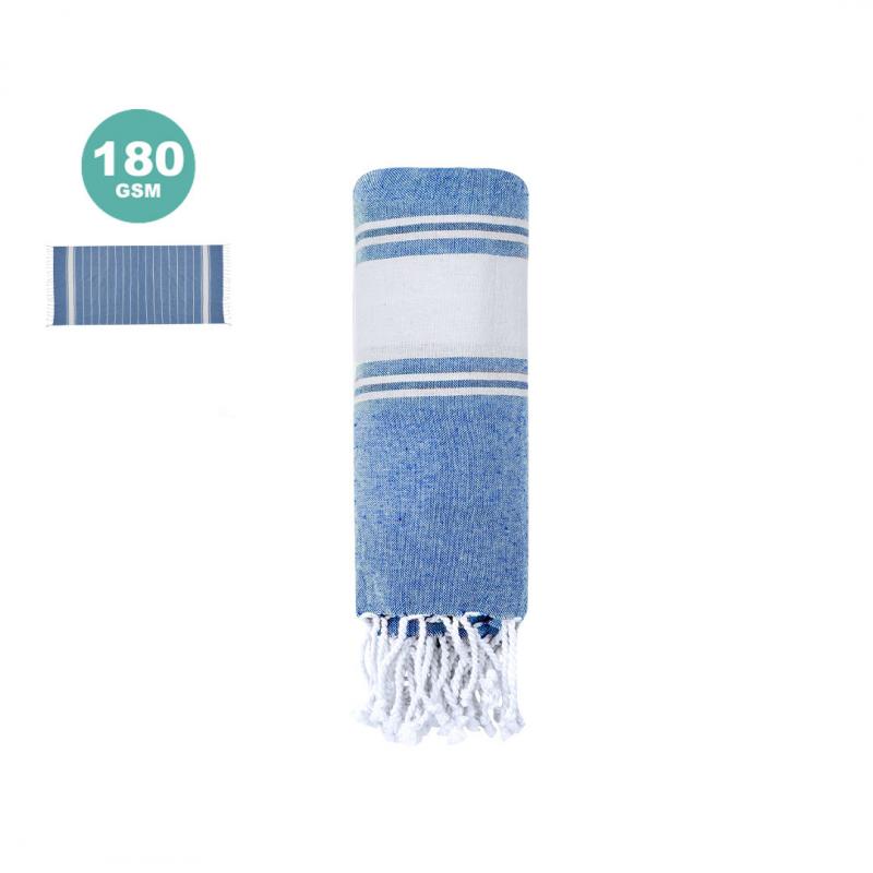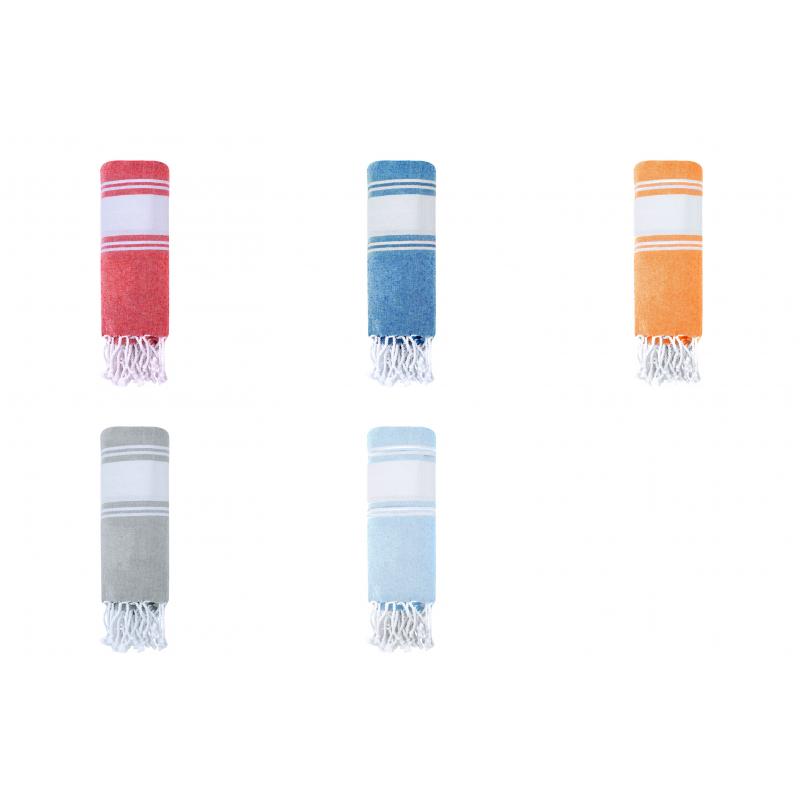 Suave pareo de toalla de 180g/m2 en combinación de algodón y poliéster. Disponible en variada gama de colores en tono bicolor. Presentado individualmente en bolsa.
