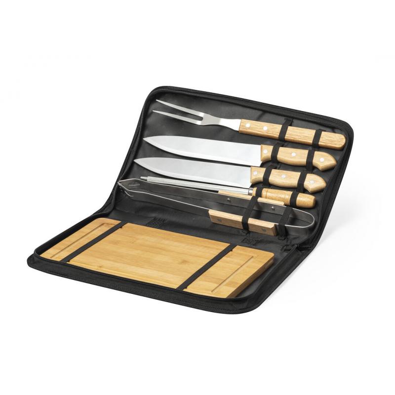 Set de barbacoa de línea nature y 6 accesorios fabricados en metal con mango de madera. Incluye 2 cuchillos, afilador, trinchador y pinzas, con tabla de bambú para corte y presentación. Presentado en estuche indvidual de resistente poliéster, con sujeciones elásticas interiores para los distintos utensilios.