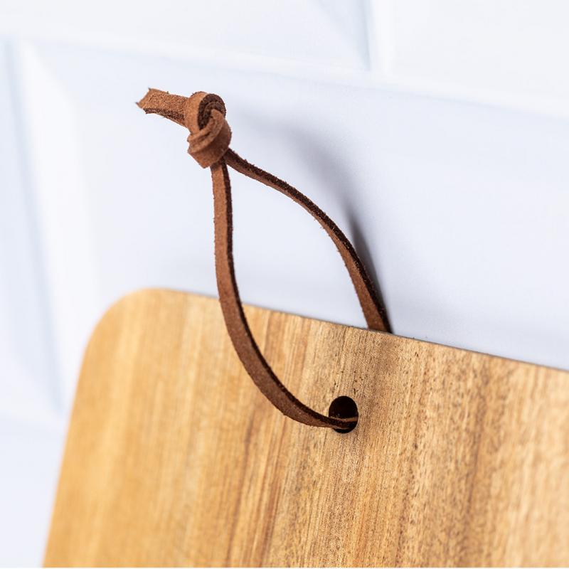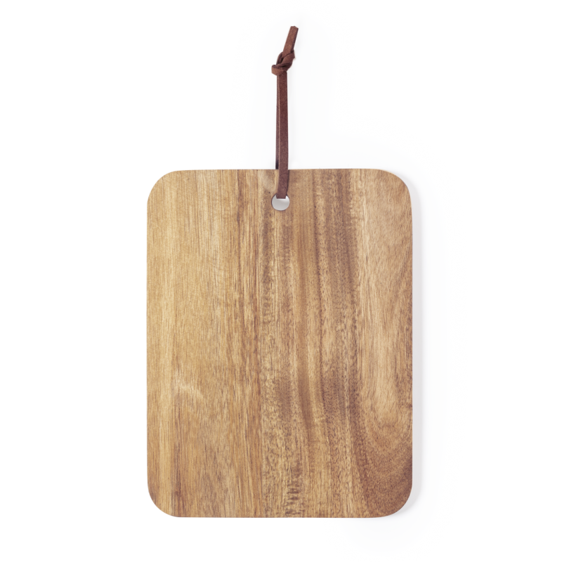 Tabla de corte y presentación fabricada en madera natural. En formato rectangular, con cordón en resistente polipiel a juego.