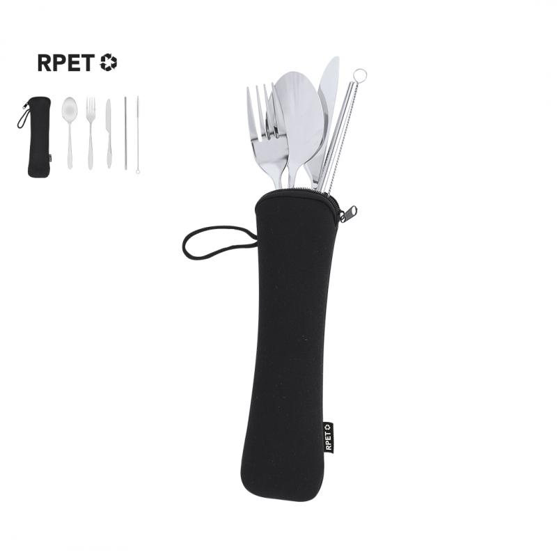 Set de cubiertos de 5 piezas fabricados en acero inoxidable. Incluye cuchara, tenedor, cuchillo, pajita reutilizable y cepillo limpiador para la pajita. Presentación en funda de Soft Shell en RPET con cierre de cremallera y cordón de transporte. Con distintivo de RPET en etiqueta.El material RPET se elabora a partir de plástico reciclado, para así fomentar la reutilización de residuos plásticos y ayudar a la sostenibilidad del planeta.