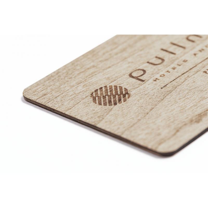 Set de 10 tarjetas de línea nature, fabricadas en madera natural con acabado veteado y especialmente diseñadas para marcaje en laser. Presentación en caja individual de cartón kraft.