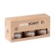 Set de 3 tarros de una selección de miel natural con dispensador de madera. Miel de flores silvestres, de lavanda y semillas de colza (50 g cada una). Se presenta en una caja de papel kraft. Incluye semillas de flores de abeja. Fabricado en la UE.