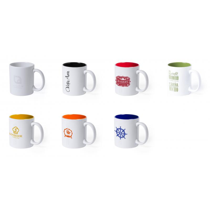 Taza de cerámica de alta calidad de 350ml de capacidad. Parte exterior en color blanco, especialmente diseñada para marcaje en láser, e interior en vivos colores. Al grabar el logotipo en la parte exterior, se muestra el color del interior de la taza. Presentada en caja individual.