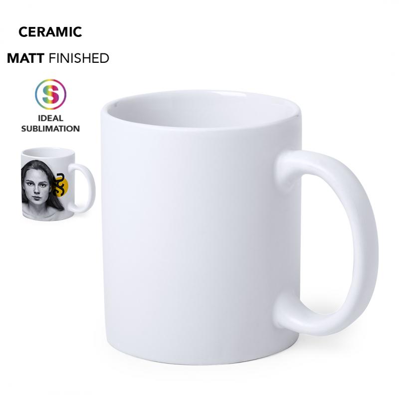 Taza de cerámica de 350ml de capacidad de acabado mate y especialmente diseñada para marcaje en sublimación. Presentada en caja individual.