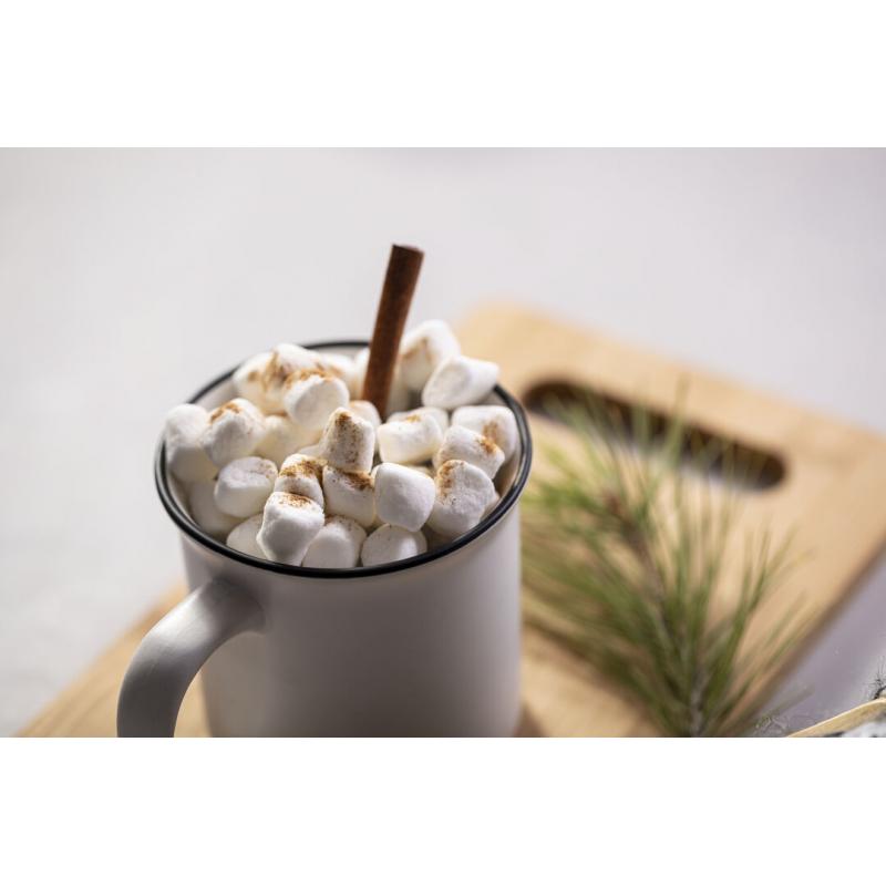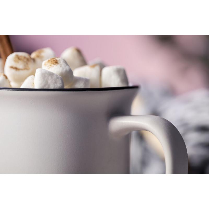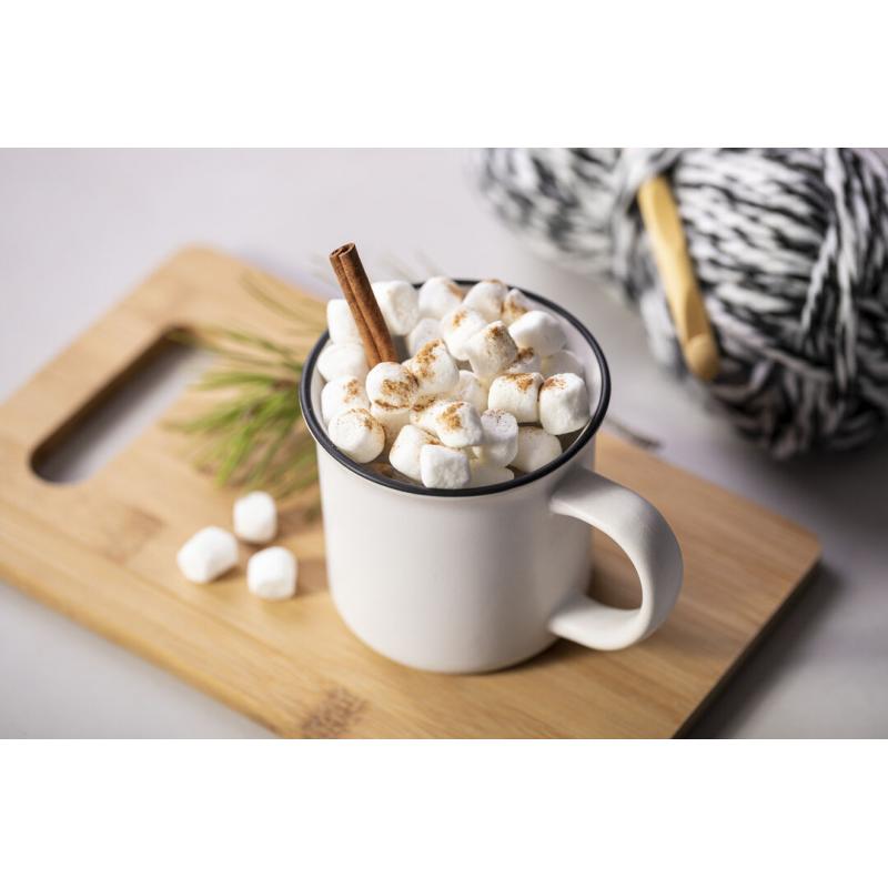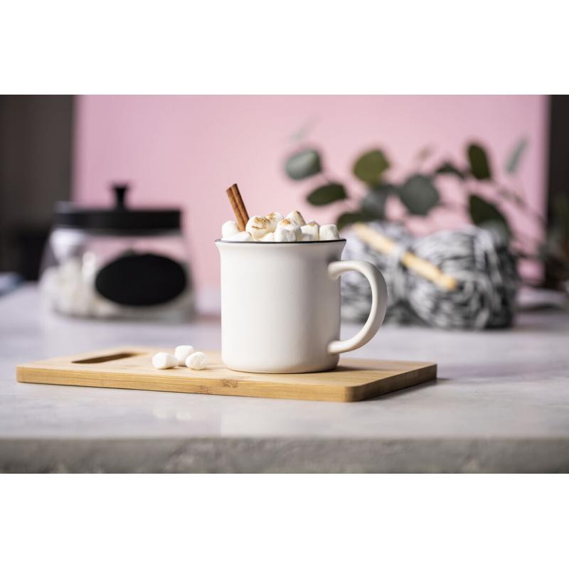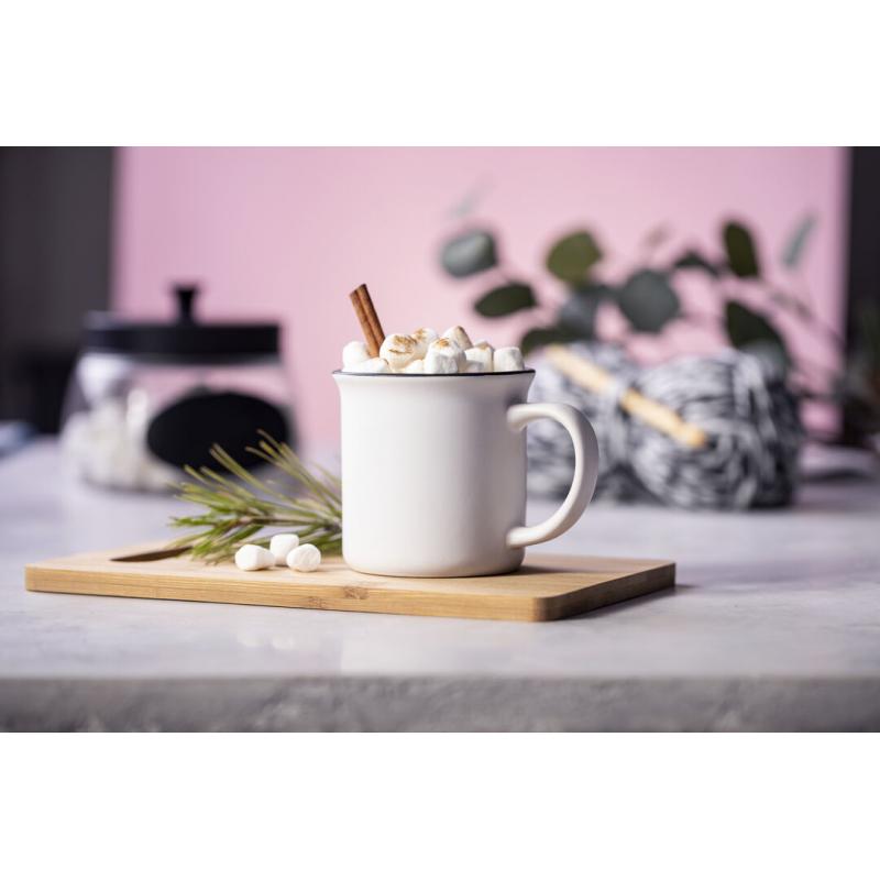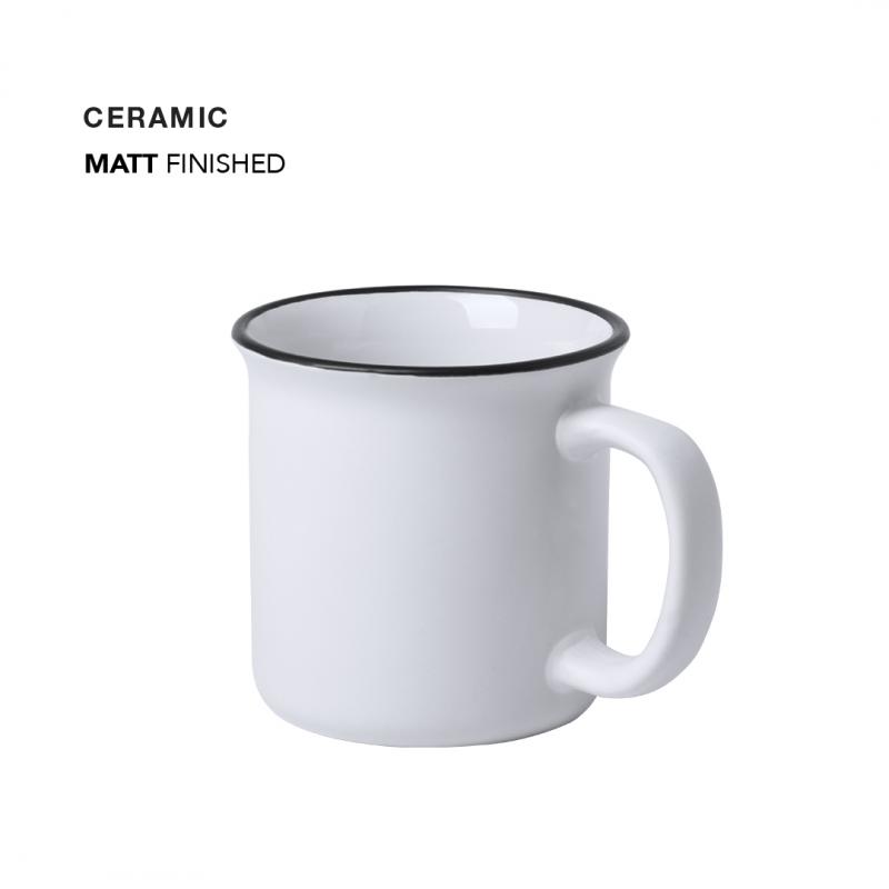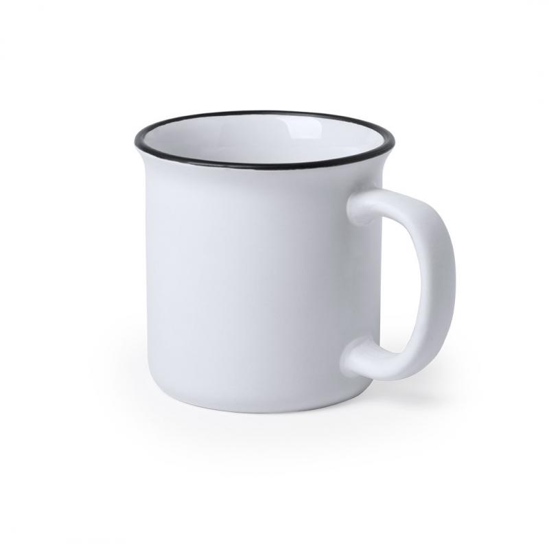 Taza de cerámica de 300ml de capacidad con diseño vintage. En sobrio diseño bicolor, con anilla en el borde. Presentada en caja individual.