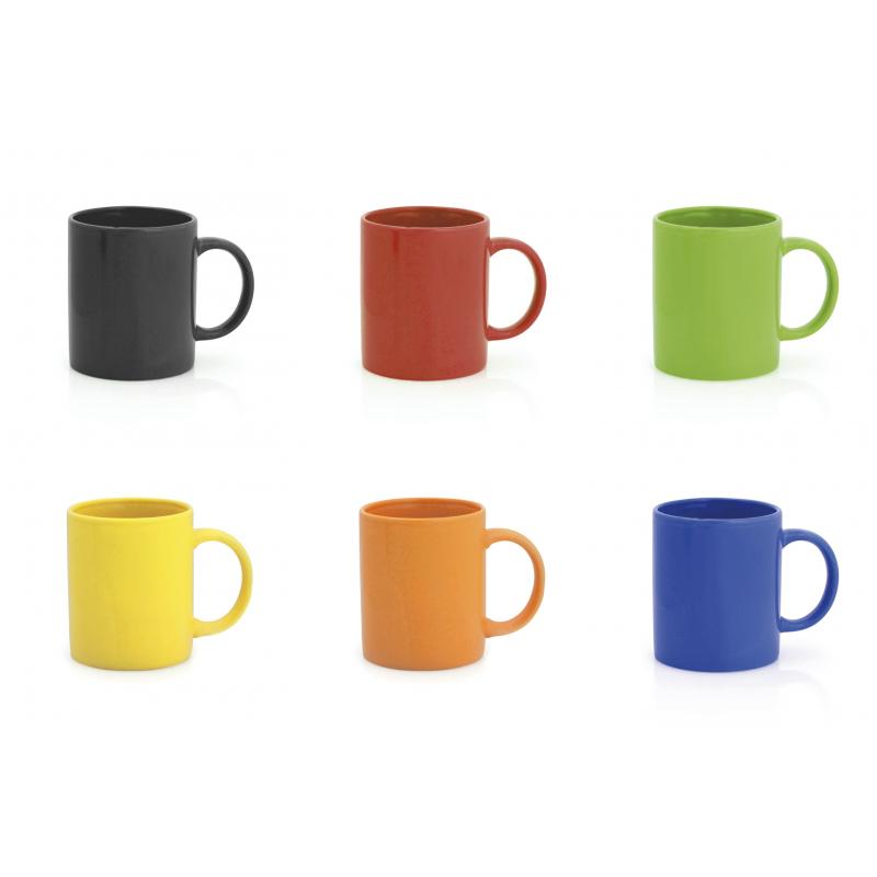 Taza de cerámica de 370ml de capacidad en divertida y amplia gama de vivos colores. Presentada en caja individual.