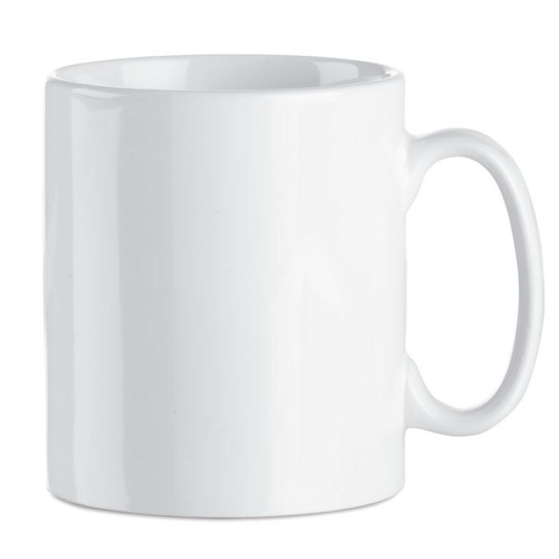 Taza de cerámica de 300 ml de capacidad con recubrimiento especial para sublimación. Embalaje individual en caja de cartón blanca.