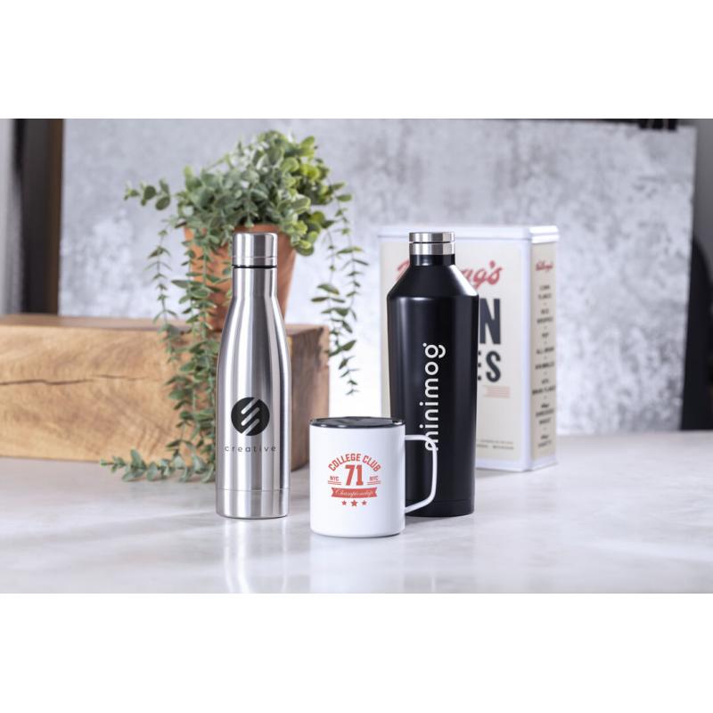 Taza térmica de acero inox, con doble pared y aislamiento de cobre al vacío, que permite mantener el calor y el frio durante un tiempo más prolongado, llegando a las 8 y 24 horas respectivamente. De 420ml de capacidad, y disponible en colores metalizados. Presentada en atractiva caja de diseño.