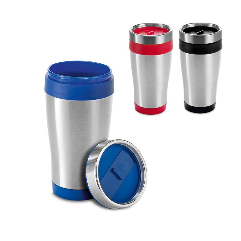 Vaso de viaje con doble pared, fabricado en acero inoxidable y PP. Tapa con sitema de apertura y cierre fácil. Capacidad de hasta 420 ml. Suministrado en cajaRecipiente :