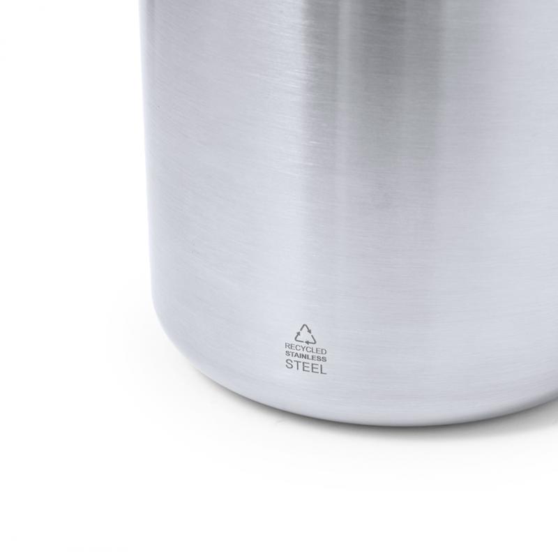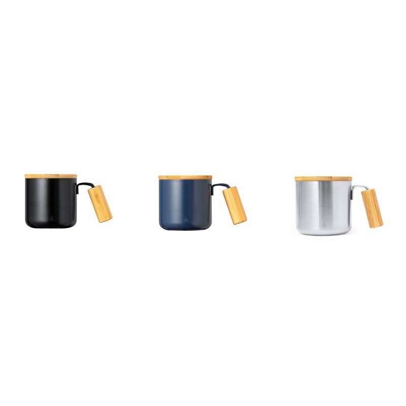 Original taza térmica de doble pared y 330 ml de capacidad. Fabricada en acero inox reciclado, con tapa de bambú y asa de cómodo agarre a juego. Con distintivo Acero Inoxidable Reciclado. Presentada en caja individual de diseño kraft y en bolsa reciclada.El acero es uno de los materiales más demandados y que puede encontrarse casi en todas partes, desde productos de uso diario a grandes construcciones. Con innumerables propiedades, entre las que cabe destacar la durabilidad y su alto grado de reutilización, convirtiéndolo en una alternativa muy valorada en soluciones de sostenibilidad. Debidamente tratado, permite obtener nuevos recursos de infinita utilización.