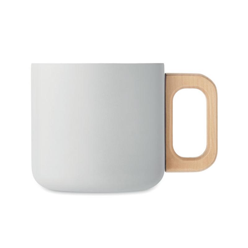 Taza de doble pared de acero inoxidable reciclado (90% de acero inoxidable reciclado y 10% de acero inoxidable) con asa de madera. Capacidad: 350 ml.Recipiente :