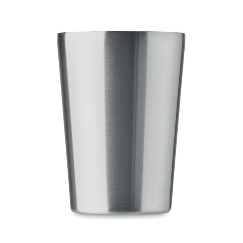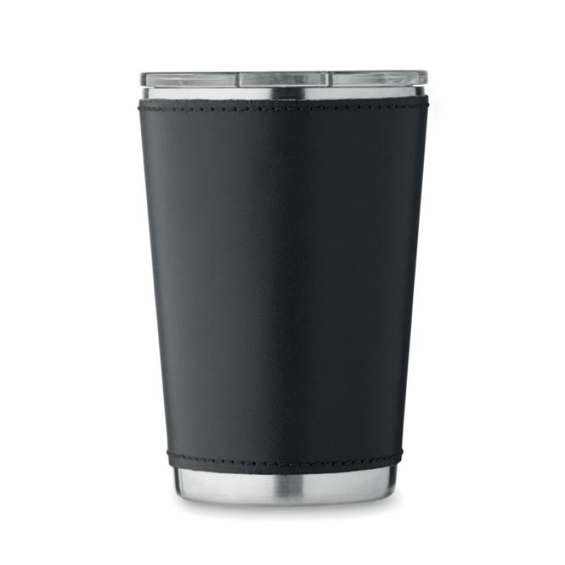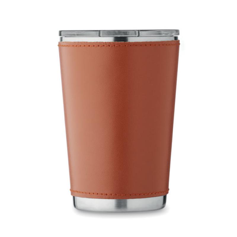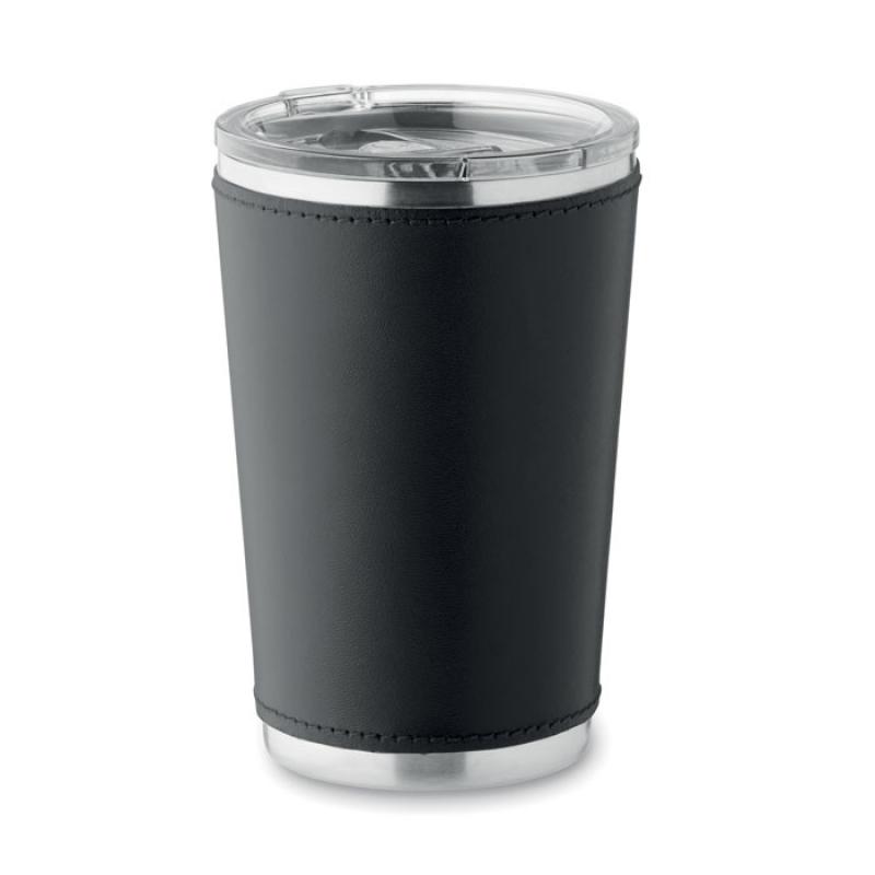 Vaso de doble pared de acero inoxidable reciclado (90% de acero inoxidable reciclado y 10% de acero inoxidable) con funda de piel sintética extraíble. Tapa con orificio deslizante. Antifugas. Capacidad: 350 ml.Recipiente :