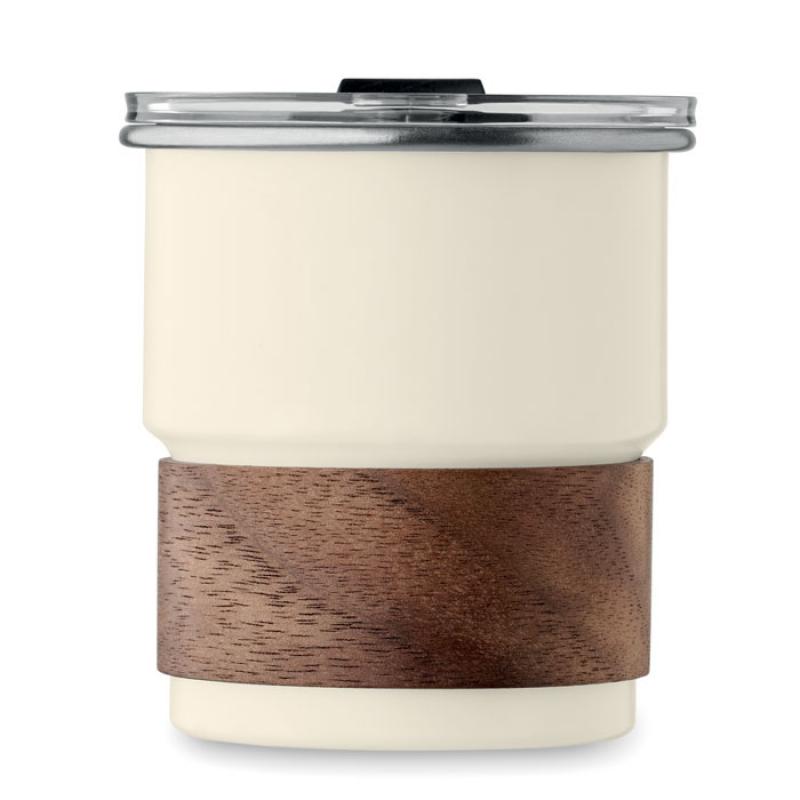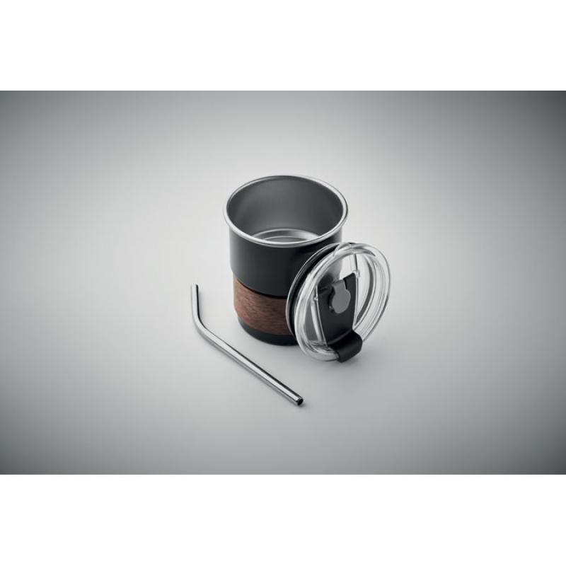 Vaso de pared simple de acero inox. reciclado (90% acero inox. reciclado y 10% acero inox) con revestimiento desmontable de madera de acacia y pajita de acero inoxidable. Tapa de apertura. Antifugas. Capacidad: 260 ml.Recipiente :