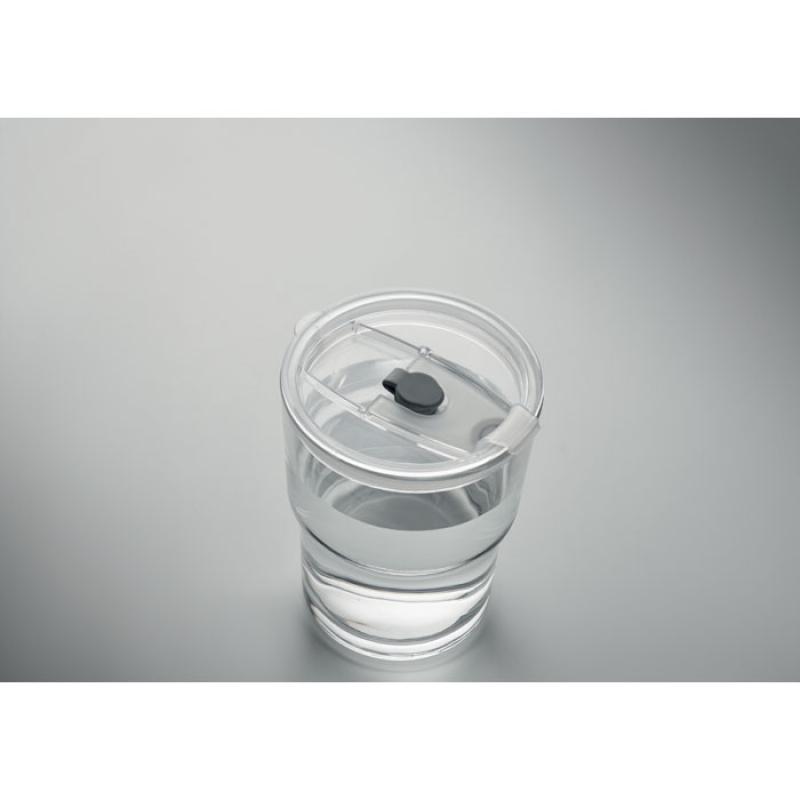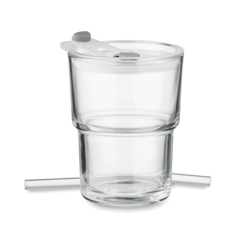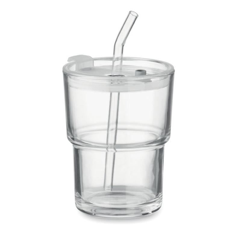 Vaso de cristal con tapa que incluye pajita de cristal extraíble. Ranura para pajita y tapa antigoteo con apertura para bebidas. Capacidad 300 ml.Recipiente :