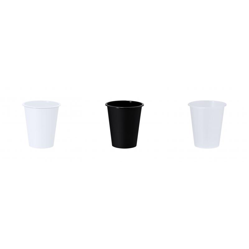 Vaso de 360 ml de capacidad en material PP. Color transparente en acabado frosted. Color blanco y negro en acabado solido.