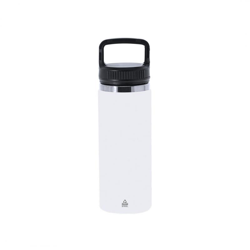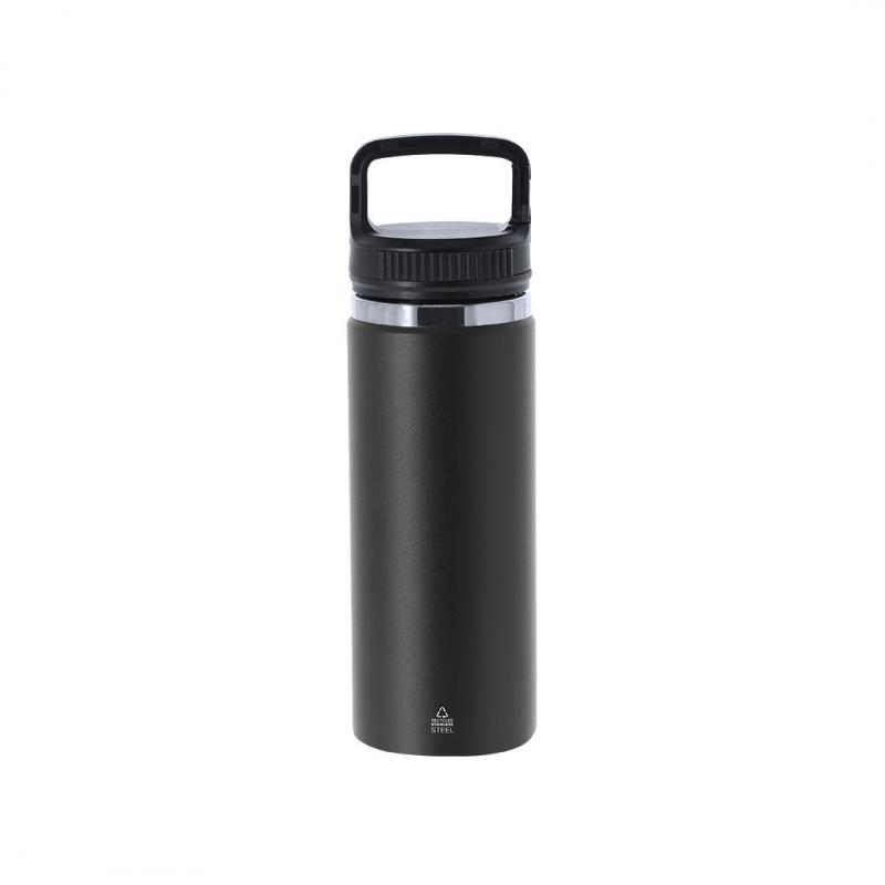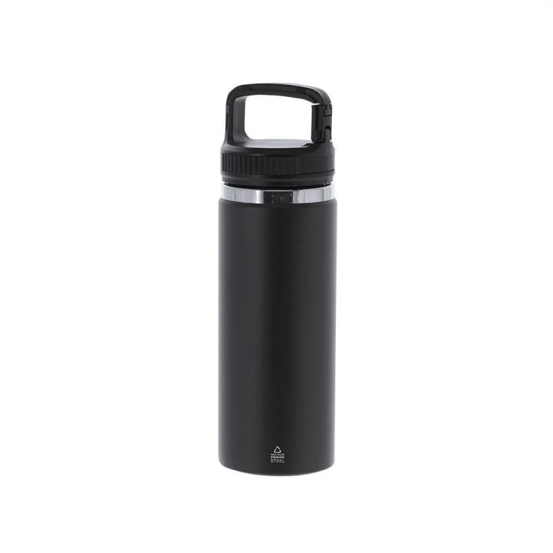 Bidón térmico de 550 ml de capacidad, fabricado en acero inox reciclado de doble pared. Cuenta con un asa funcional con doble función de mosquetón, que facilita un transporte cómodo y versátil. Con tapadera a rosca y base en color mate, complementada con un elegante aro decorativo en plata. Libre de BPA.El acero es uno de los materiales más demandados y que puede encontrarse casi en todas partes, desde productos de uso diario a grandes construcciones. Con innumerables propiedades, entre las que cabe destacar la durabilidad y su alto grado de reutilización, convirtiéndolo en una alternativa muy valorada en soluciones de sostenibilidad. Debidamente tratado, permite obtener nuevos recursos de infinita utilización.