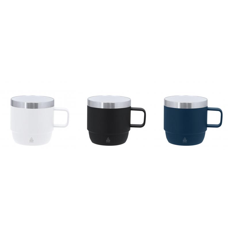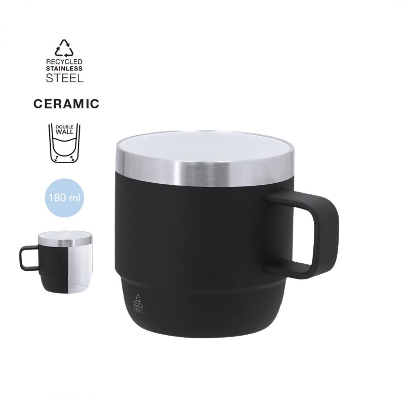 Taza fabricada en Acero Inox Reciclado de doble pared y 180ml de capacidad. Con doble pared para mejor y más duradera conservación de la temperatura e interior con recubrimiento de cerámica, apto para bebidas carbonatadas. Con distintivo de Acero Inox Reciclado.El acero es uno de los materiales más demandados y que puede encontrarse casi en todas partes, desde productos de uso diario a grandes construcciones. Con innumerables propiedades, entre las que cabe destacar la durabilidad y su alto grado de reutilización, convirtiéndolo en una alternativa muy valorada en soluciones de sostenibilidad. Debidamente tratado, permite obtener nuevos recursos de infinita utilización.