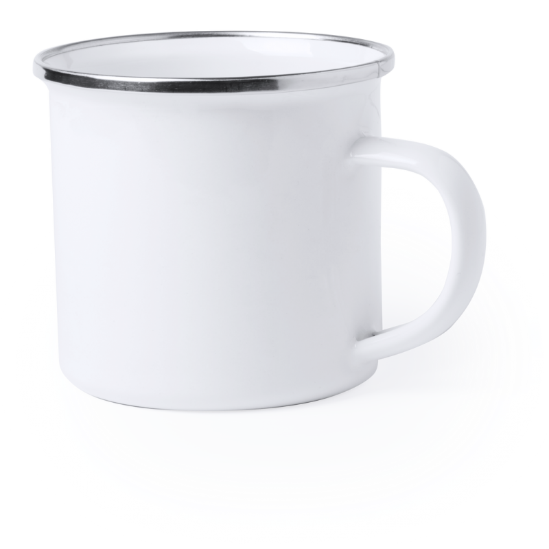Taza metálica de diseño retro y 380ml de capacidad, con pequeñas imperfecciones para un aspecto vintage . Especialmente diseñada para marcaje en sublimación, con elegante anilla cromada y presentada en caja individual.