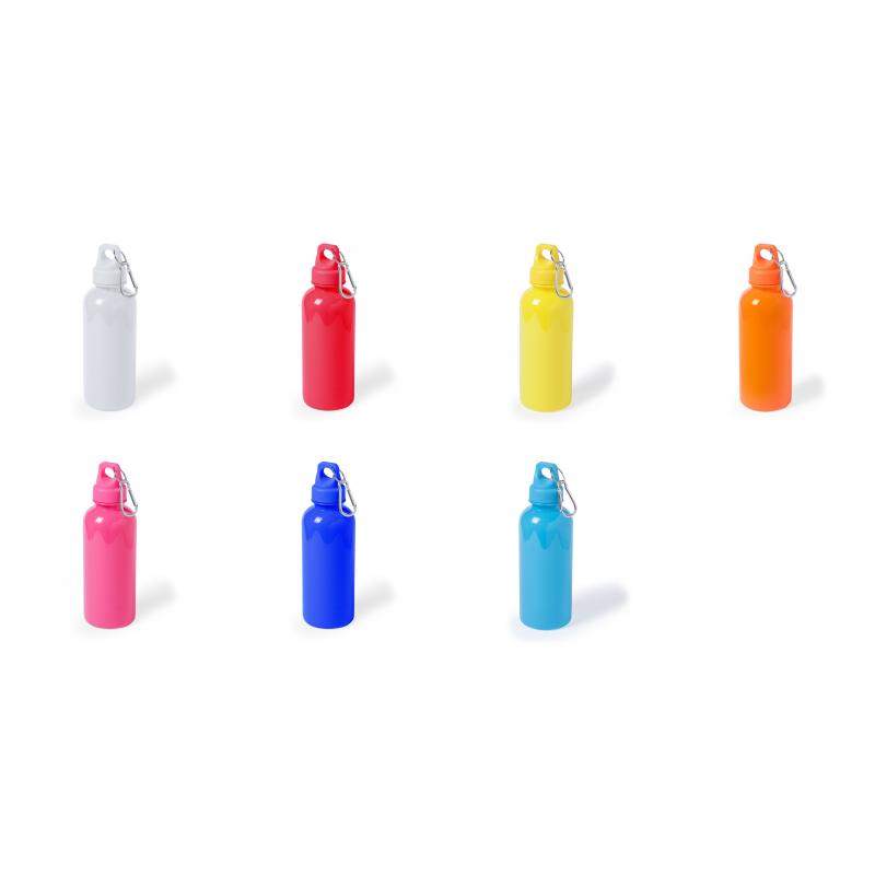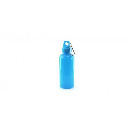 Bidón de 600ml de capacidad con cuerpo de acabado en PS translúcido de vivos y variados colores. Con tapón de seguridad a rosca y mosquetón metálico de transporte.